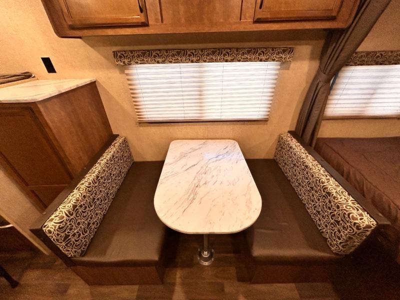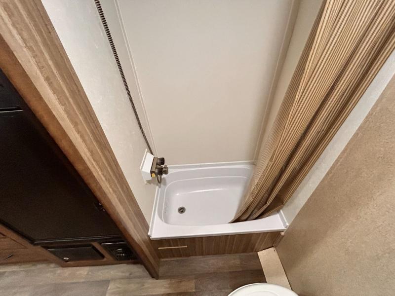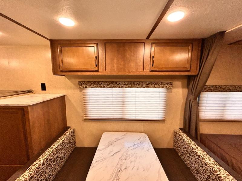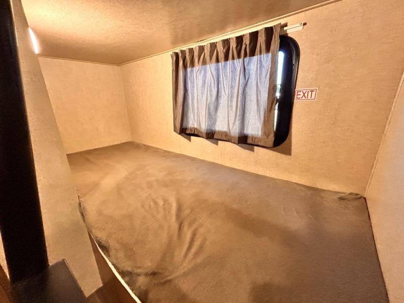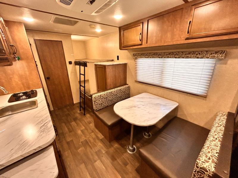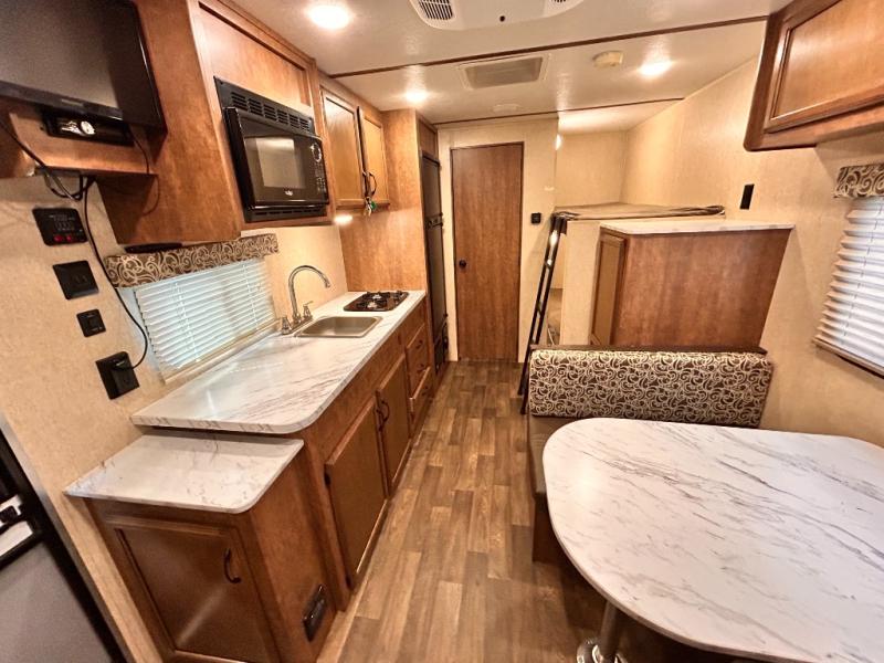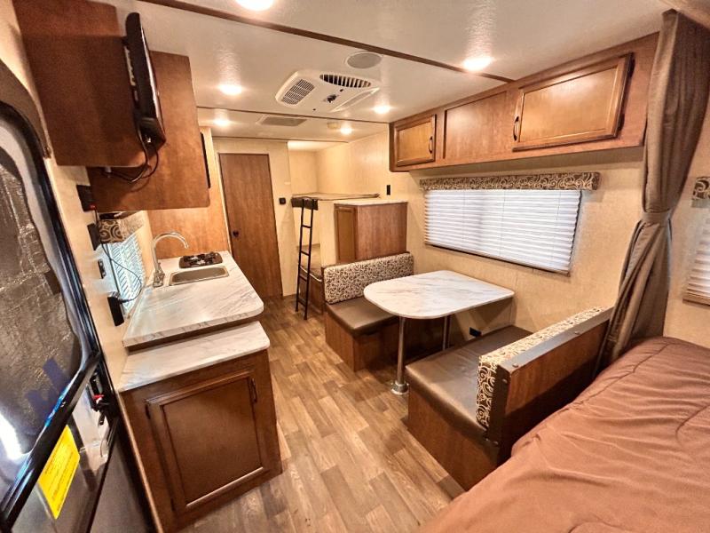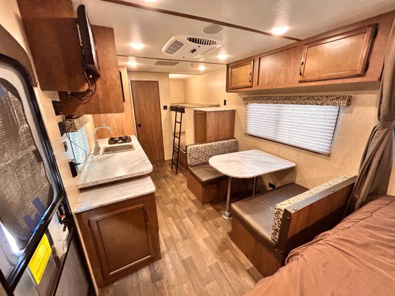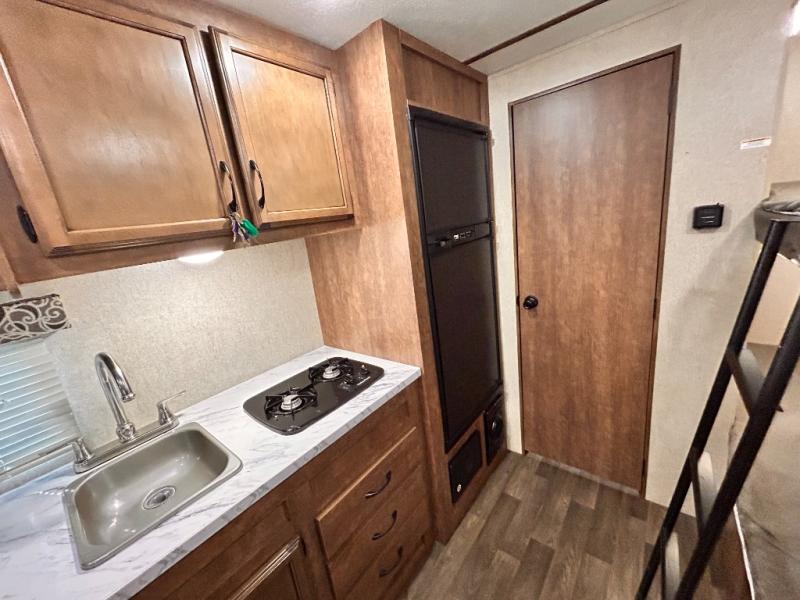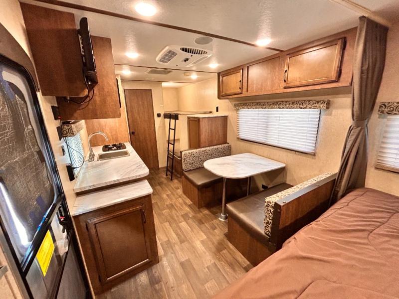 You are going to love the functionality and convenience of this 20BH Autumn Ridge Outfitter travel trailer! With a rear set of bunk beds for your kids, a front queen bed for mom and dad, and a dinette which can easily convert into additional sleeping space you can accommodate a family of six. The rear bathroom has a tub/shower and a toilet for your convenience. Between the bunk beds and the dinette there is a large pantry for all of your canned goods.