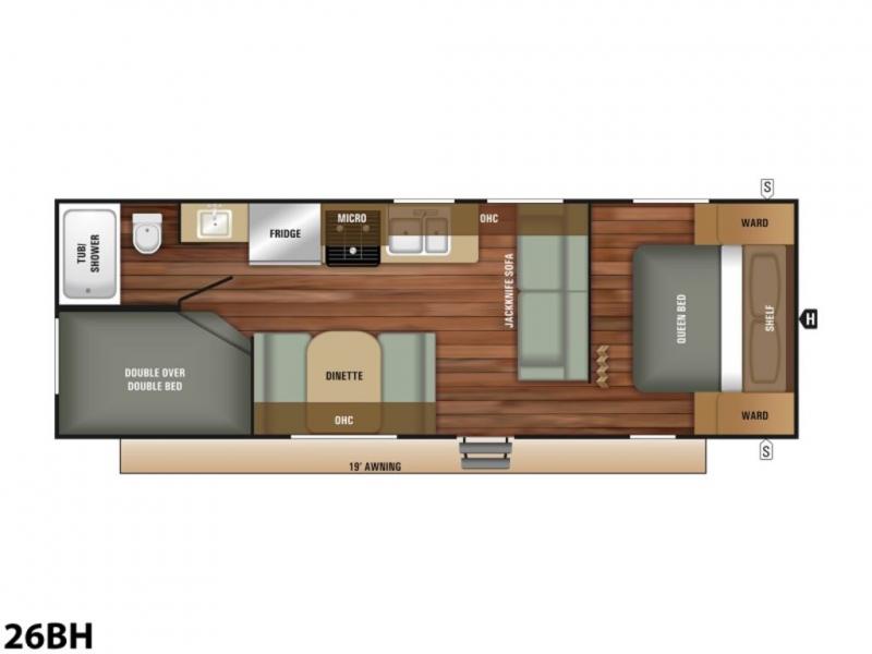 Come enjoy time away from home while camping in this Autumn Ridge Outfitter 26BH travel trailer! With sleeping accommodations for up to ten people this model is ideal for a family with multiple kids or for the family who enjoys camping with friends! Mom and dad can sleep at the front queen bed, in the rear there is a set of double bunk beds which sleep four people, plus the dinette and the jack knife sofa can convert into sleeping spots! In the rear right corner you will find a bathroom where you can easily get ready for the day. When the weather is nice and you just want to relax then grab your camping chair and come enjoy the shade while sitting under the 19' awning!
