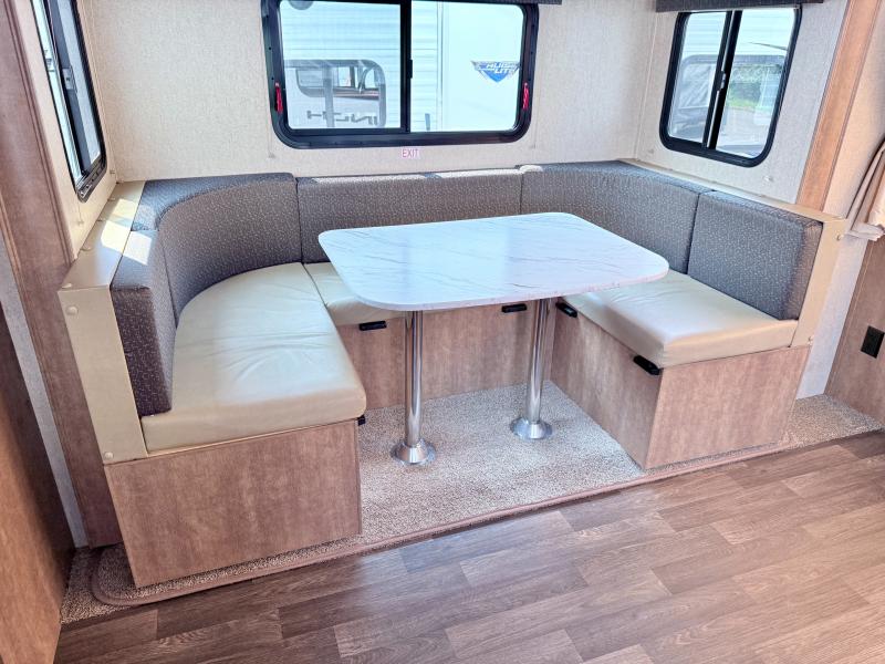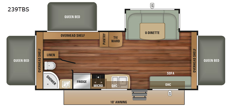 This Starcraft Launch Outfitter expandable 239TBS features sleeping space for up to 10 individuals with an additional side expandable, and provides everything you need to enjoy your time away from home. There is plenty of space to place your bags and knick knacks on the overhead shelves. A U-shaped dinette is available for you to enjoy your meals at or convert into an extra sleeping space. When you're ready to wind down your night or just enjoy time outside away from the sun then you can set a chair up underneath the 18' awning.