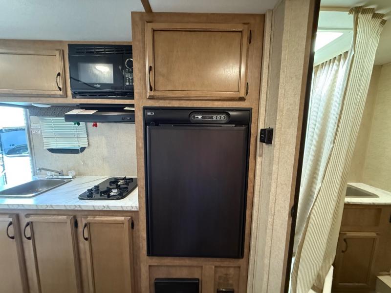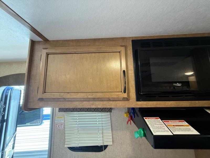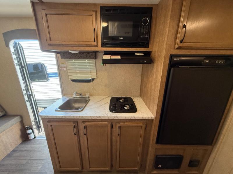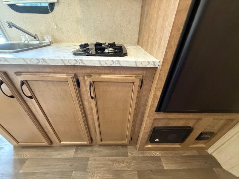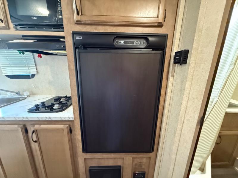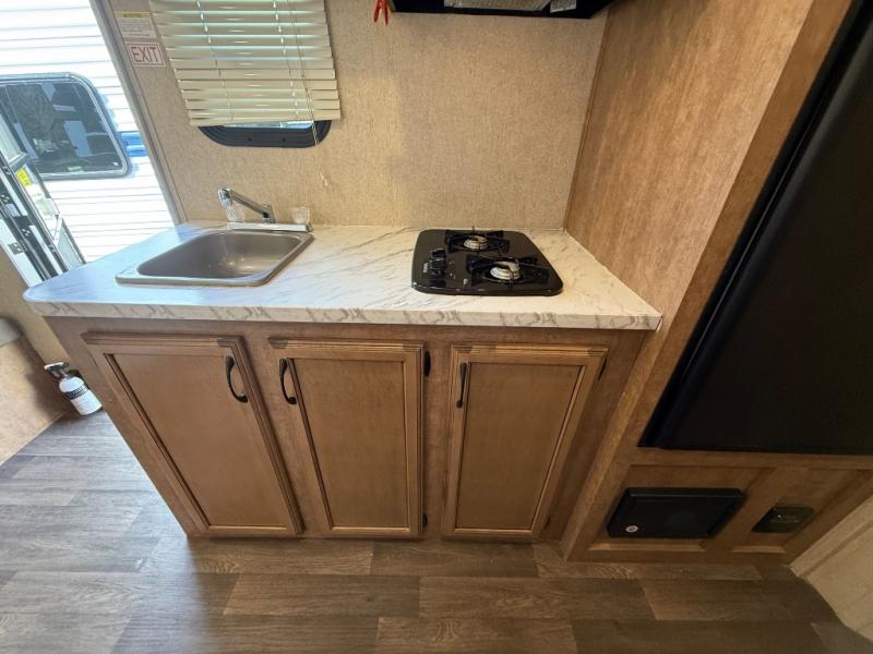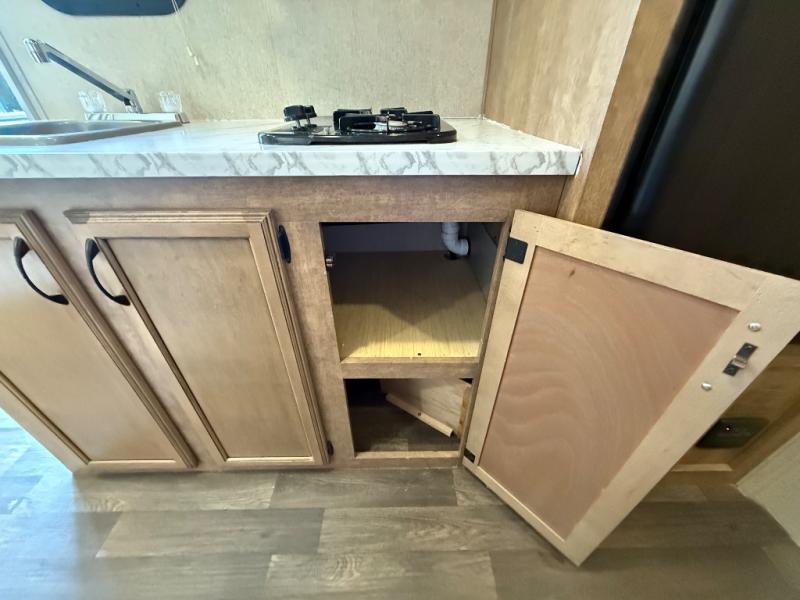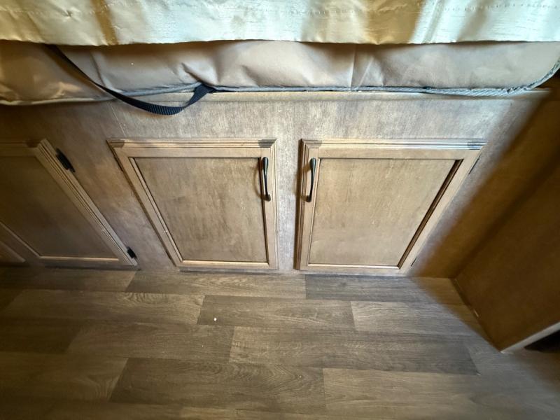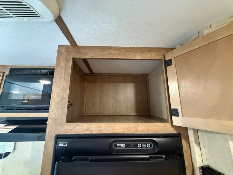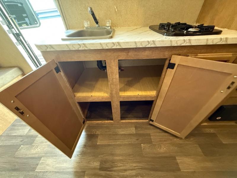 To the left of the entry door you will find your kitchen area which features a single sink, a two burner cook-top with overhead microwave oven, and a refrigerator. Opposite just off the side queen tent end bed, and next to the dinette, there is a food storage pantry. There are also overhead cabinets above the opening to the side queen tent end bed for added storage to help keep things neat and tidy.