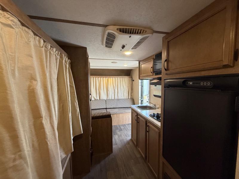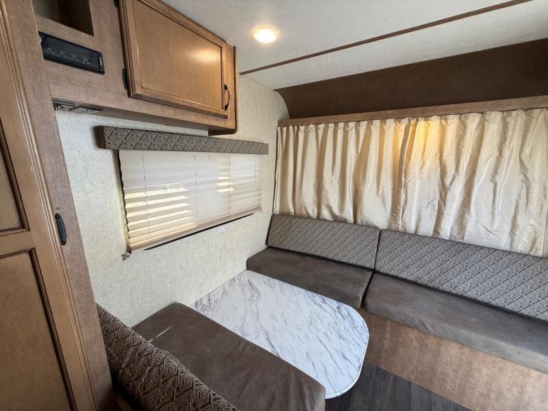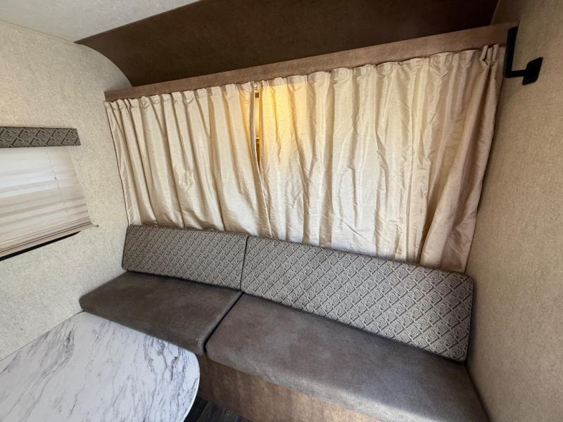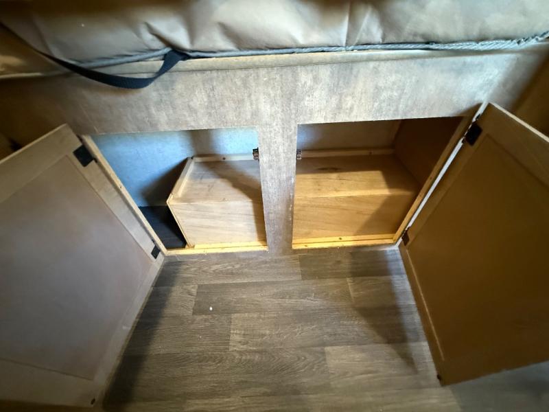 Straight in the door you will notice the booth dinette. This is perfect for dining, or playing board games, plus the front seat extends across the entire width of the unit. You will also find an overhead shelf above the opening to the front tent end bed here as well.