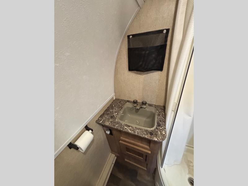 Along the rear of this model is the bathroom area. Here you will find a corner shower, a sink, a toilet, and a wardrobe.