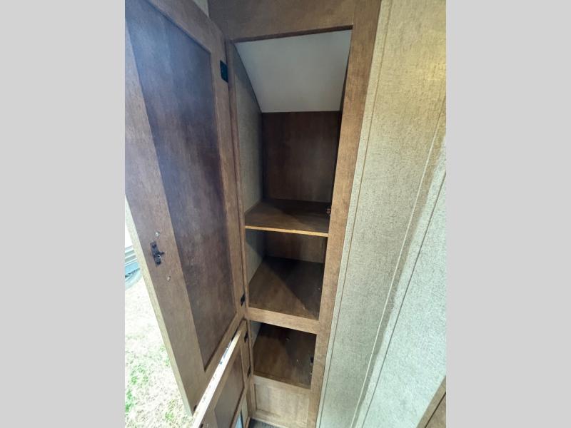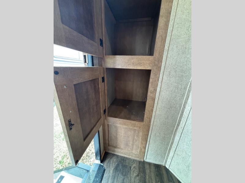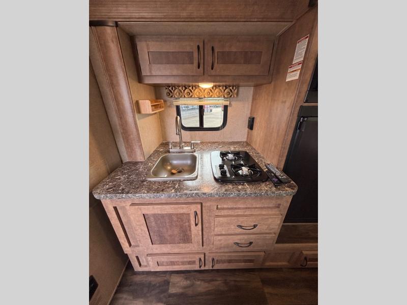 The slide out along the road side features a sink, a two burner range, a refrigerator with an overhead microwave, and an overhead cabinet where you can store dishes. Across from the slide out is the dinette and overhead cabinet, and located along the very front of this model is a queen bed.