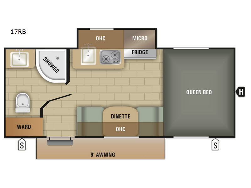 The slide out along the road side features a sink, a two burner range, a refrigerator with an overhead microwave, and an overhead cabinet where you can store dishes. Across from the slide out is the dinette and overhead cabinet, and located along the very front of this model is a queen bed.