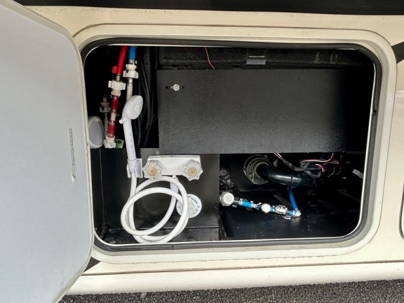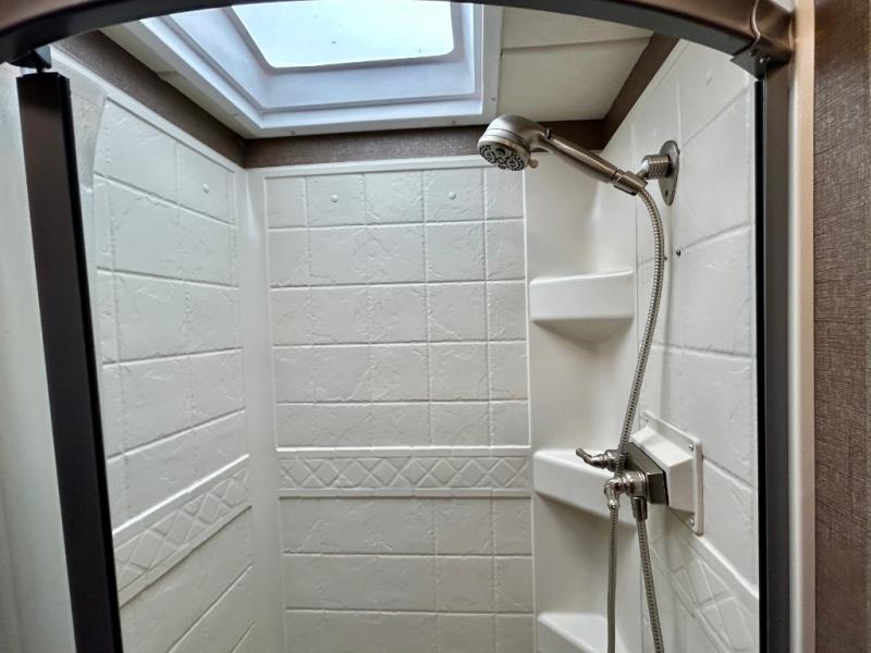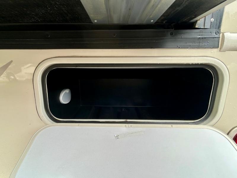 At the front, there is a drop-down overhead bunk for extra sleeping space. Also in the front cab area you will find a coffee table where you can sit and enjoy your morning cup of Joe.