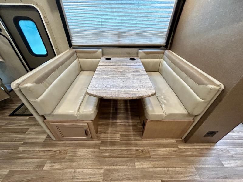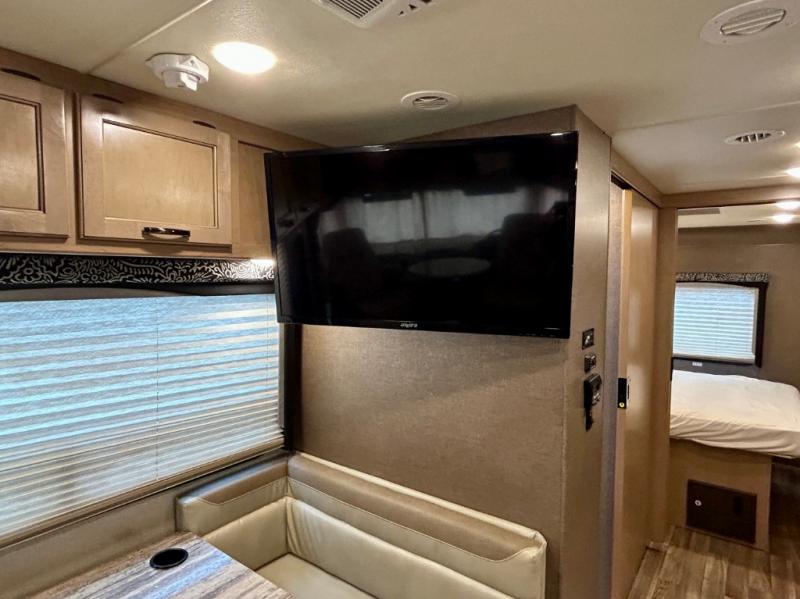 A spacious booth dinette has a 40" LED TV mounted above it, facing the front of the motorhome for easy viewing from all seats, including the captain's chairs.