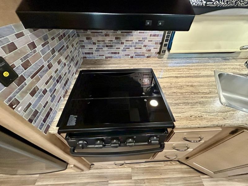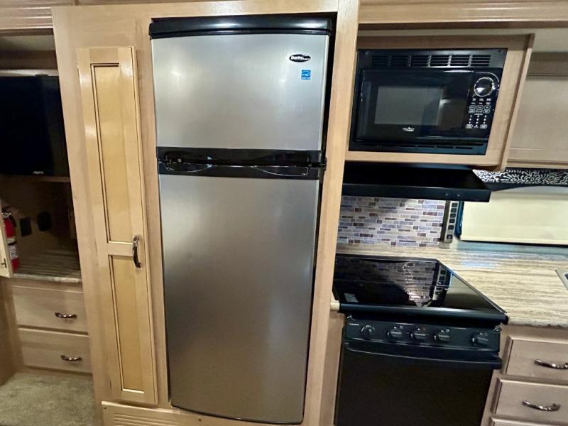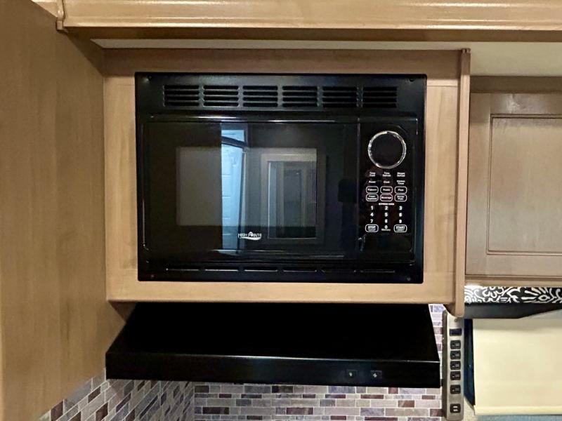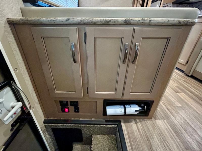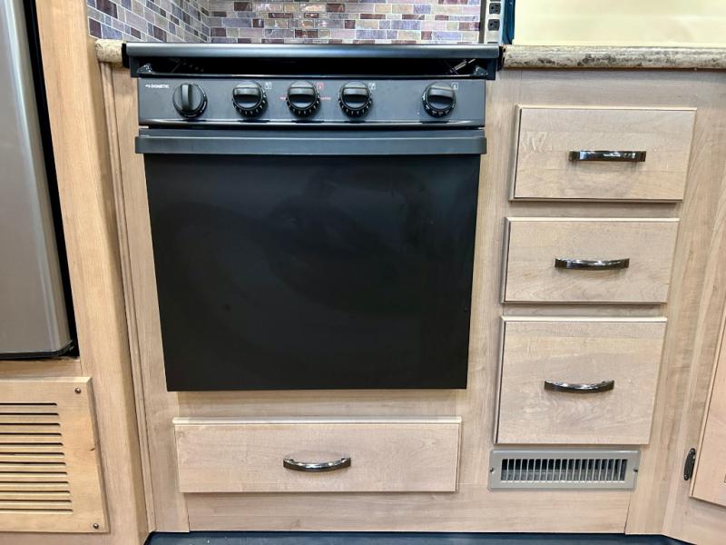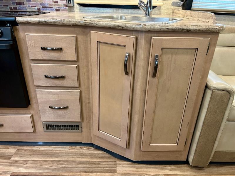 The large roadside slide includes a jack-knife sofa with drink holders behind it as well as overhead cabinets. It can easily be transformed into sleeping for one extra guest. The slide out continues with a kitchen sink, overhead cabinets, a three burner range with overhead microwave, and a refrigerator. There is also a food pantry for your dry and canned goods.