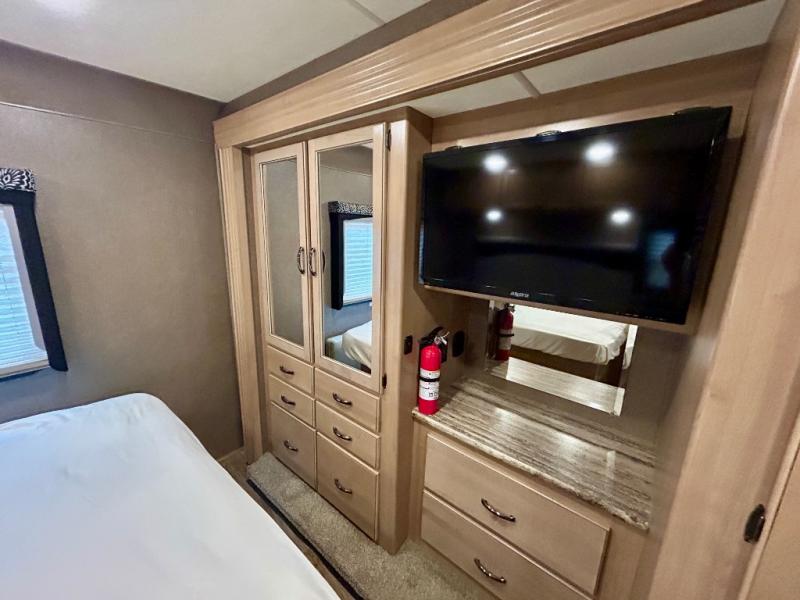 Moving into the bedroom area, still within the full wall slide out, there is a dresser and closet with a 32" LED TV. The bedroom also includes a queen bed with nightstands on each side plus overhead cabinets.