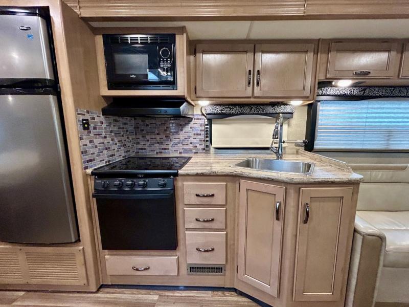Step into this Thor Motor Coach A.C.E. 29.3 class A gas coach to find a full roadside slide out creating an open at-home feel, plus there is an exterior kitchen for the outdoor chef in the family.