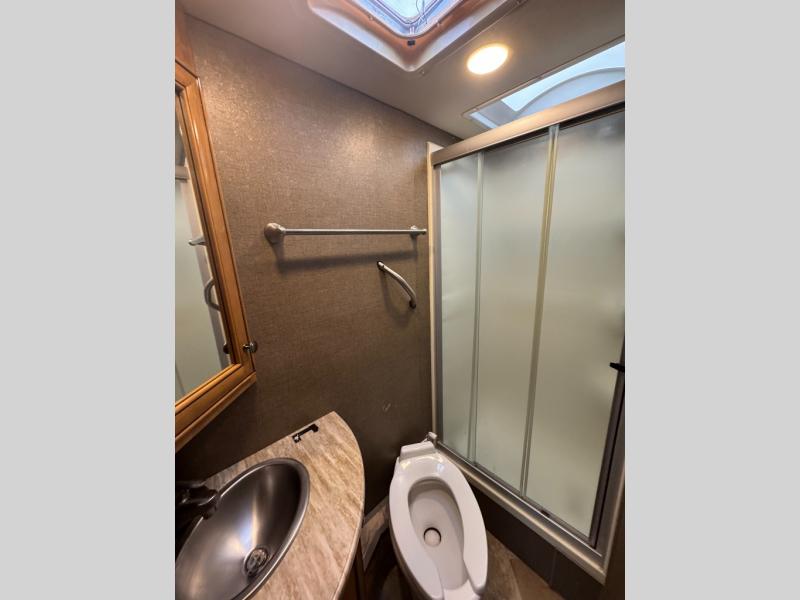 A rear corner bath features a 24" x 32" shower, toilet, and vanity with sink, plus overhead medicine cabinet. The opposite corner features a queen size bed slide out along the road side plus a nightstand and more overhead cabinets. There is a 32" LED TV, and more.