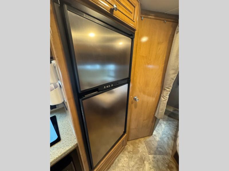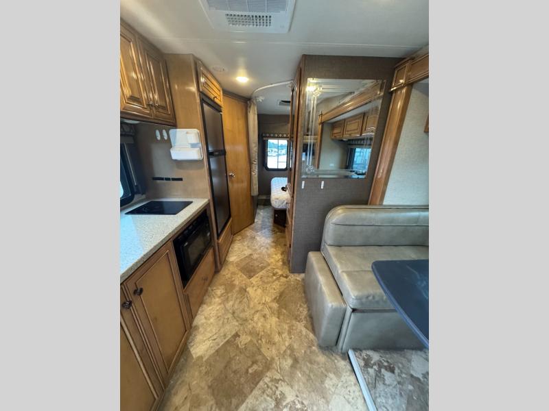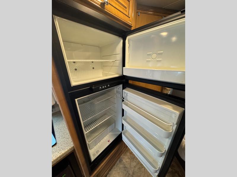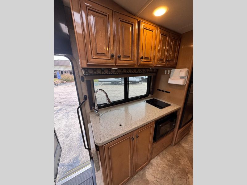 Model 24SS offers double slides, a rear corner bath, and cab-over bunk for an added 36" x 75" sleeping space. Enter just behind the front passenger seat and notice the 32" LED TV overhead. To your immediate left there is a kitchenette that will allow you to easily make meals and snacks on the road. There is a round single sink, some counter space including a flip-up countertop, and an induction single burner cooktop, plus overhead microwave oven. There is also a refrigerator for your perishables.