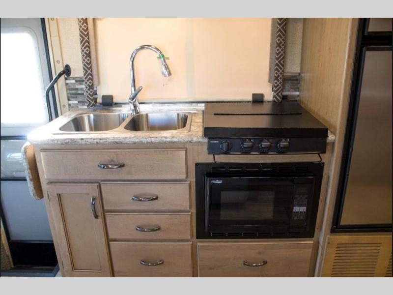 On the opposite side you can make your favorite meals with the three burner range, microwave oven, double kitchen sink, and refrigerator. There is a flip-up countertop and overhead cabinets as well.