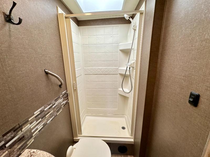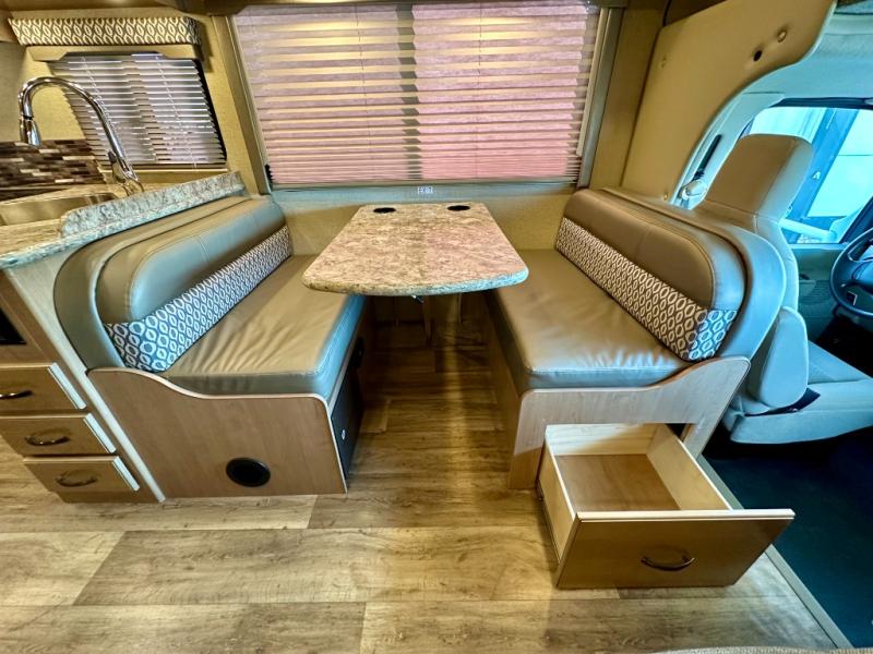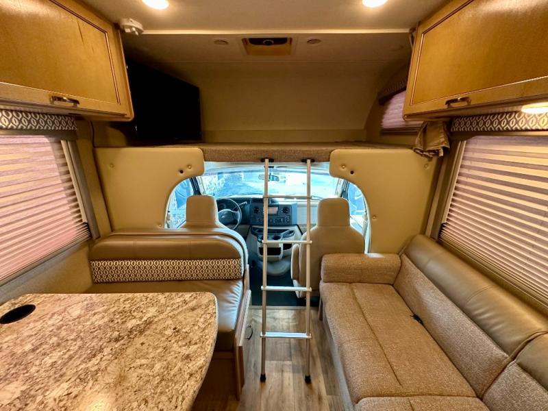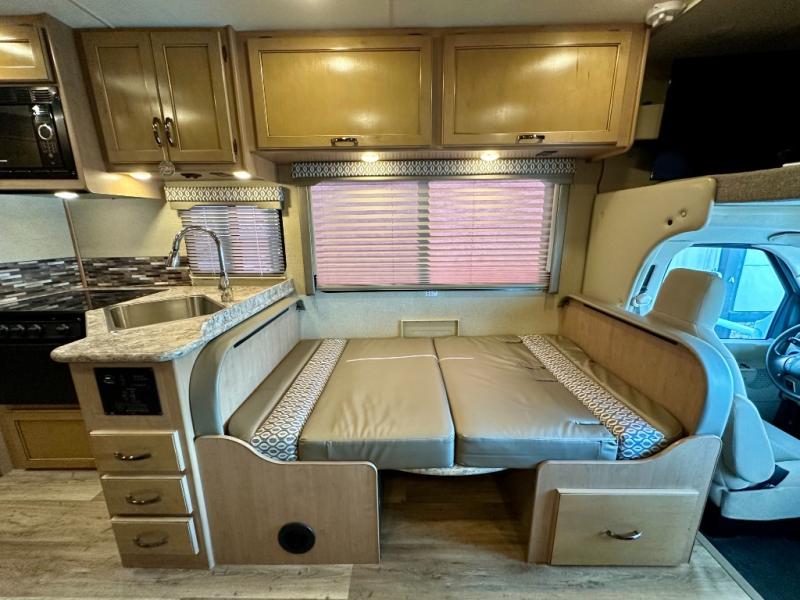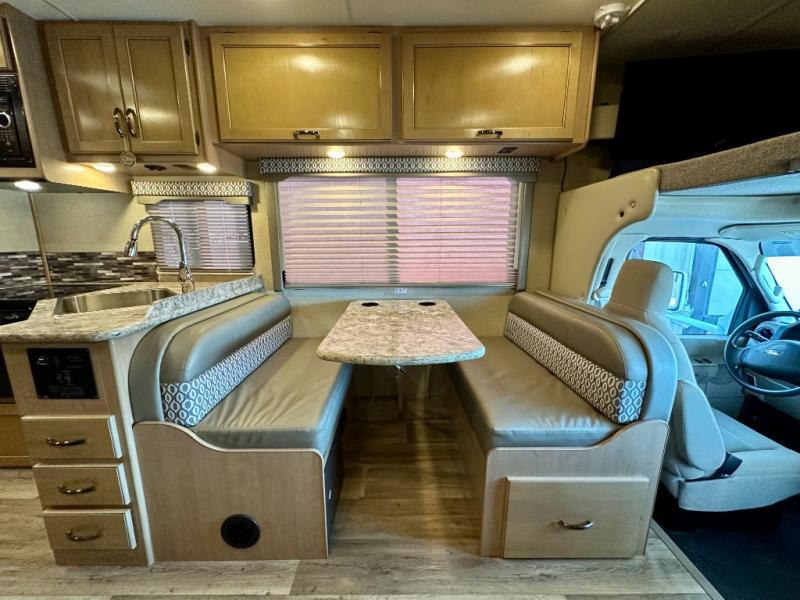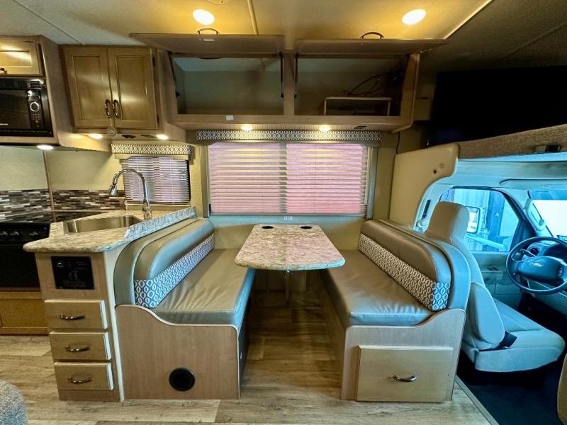 There are plenty of comforts throughout this 26HE Freedom Elite motor home by Thor Motor Coach, such as a single slide out, a full-size bathroom, plus in the front area just past the cab you will find a seating for your whole family at the dinette and sofa.