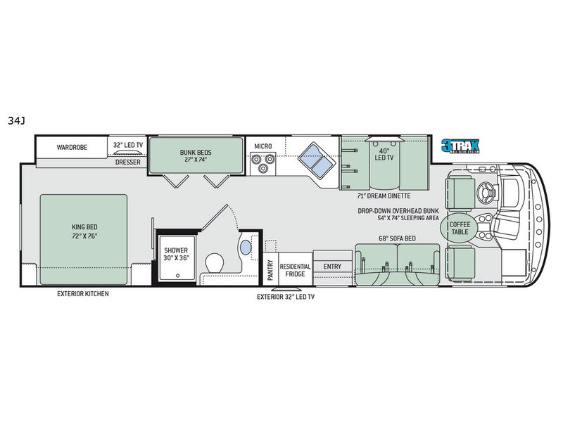 Take Hurricane model 34J by Thor Motor Coach out to the next tailgate and everyone will be in your spot! You have an exterior kitchen for keeping snacks and drinks and an exterior 32" LED TV to watch the big game while you party! If there isn't a game this weekend, take 34J and a few of your friends out to the nearest campground and park for the weekend. Everyone will have a place to sleep, there is space for up to ten individuals! There is also a nice sized bath for all of your cleanliness needs.