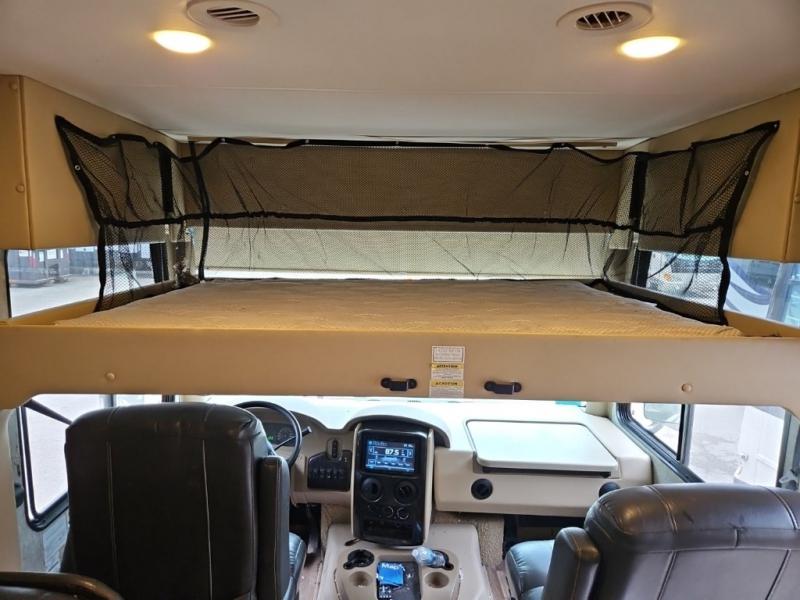 Step inside behind the cab area to see a coffee table between the captain's chairs and a drop-down overhead bunk above for extra sleeping space.