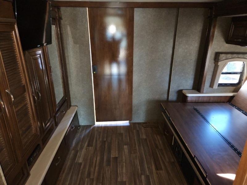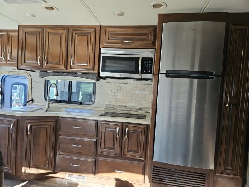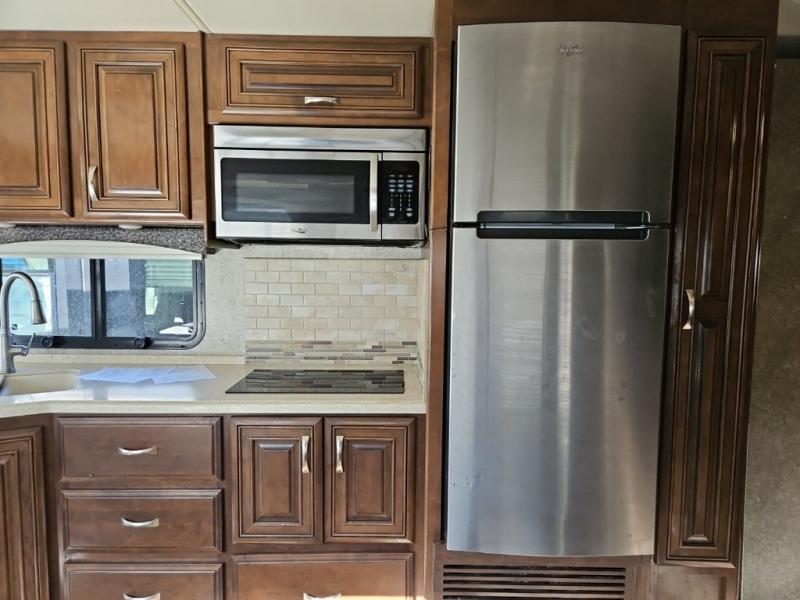 Next to the entry along the curb side wall there is a double kitchen sink, counter space, two burner range with microwave above, a residential refrigerator, and a pantry. On the opposite side you will enjoy a dream dinette and sofa slide out. You may choose optional theater seating for two in place of the sofa if you like. When it's time to watch a movie or the big game, the Always-in-View 40" LED TV along the interior wall is available.