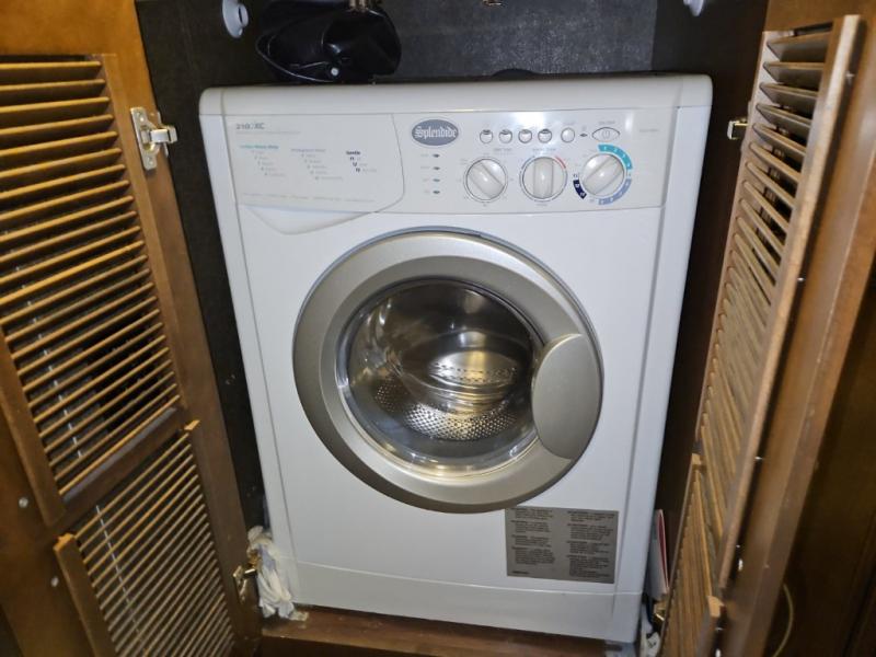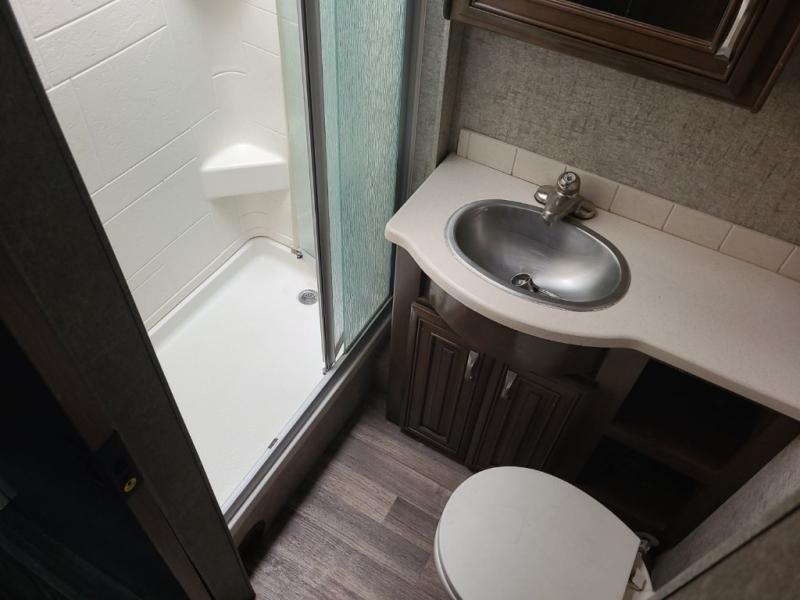 Next, the first full bath includes a shower, toilet, vanity and sink with linen storage. On the opposite side there is a slide out set of bunks that also converts to a sofa and closet. Continuing in the slide you will find a washer and dryer combo prepped space, 32" LED TV, dresser, and closet in the bedroom. A Tilt-A-View inclining king bed slide with nightstands is across from the TV. As you walk through the bedroom the second full bath is in the rear of the coach. There is a shower, toilet, vanity with sink, and overhead storage for your toiletries and things.