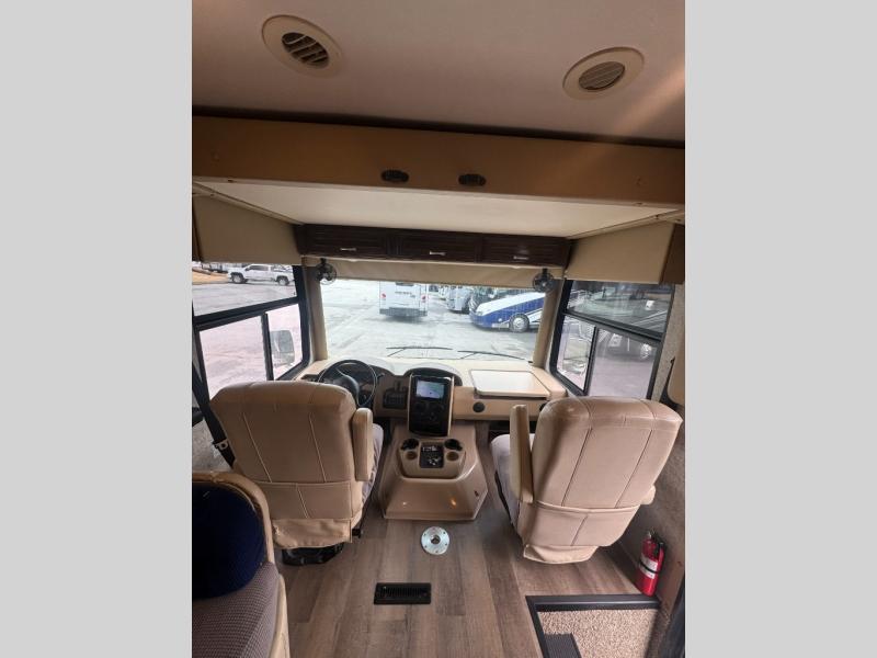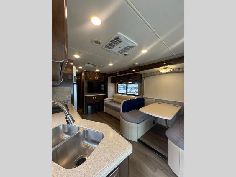 Step inside behind the cab area to see a coffee table between the captain's chairs and a drop-down overhead bunk above for extra sleeping space.