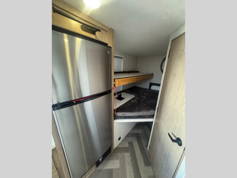 Next, the first full bath includes a shower, toilet, vanity and sink with linen storage. On the opposite side there is a slide out set of bunks that also converts to a sofa and closet. Continuing in the slide you will find a washer and dryer combo prepped space, 32" LED TV, dresser, and closet in the bedroom. A Tilt-A-View inclining king bed slide with nightstands is across from the TV. As you walk through the bedroom the second full bath is in the rear of the coach. There is a shower, toilet, vanity with sink, and overhead storage for your toiletries and things.