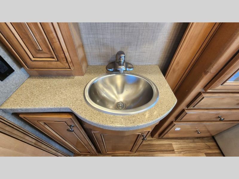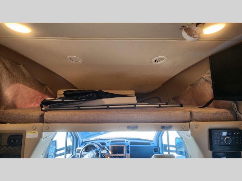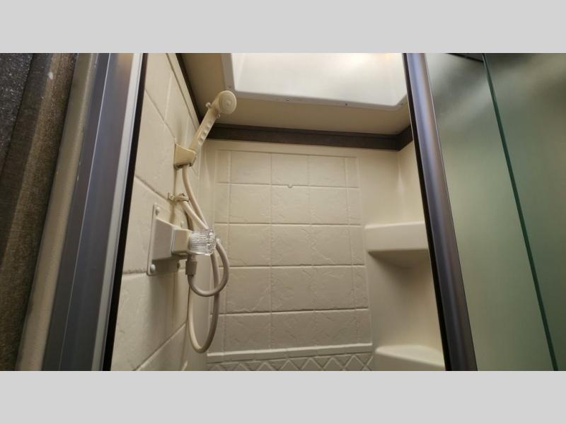 When it is time to turn in for the night, you will find yourself being drawn to the rear full-size bed. There is a privacy curtain along the foot of the bed, two overhead cabinets for your personal belongings, and a 28" LED TV along the wall.