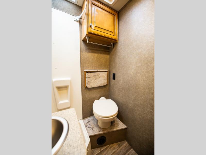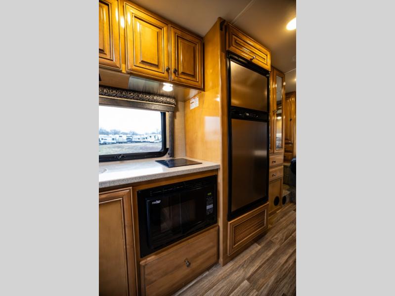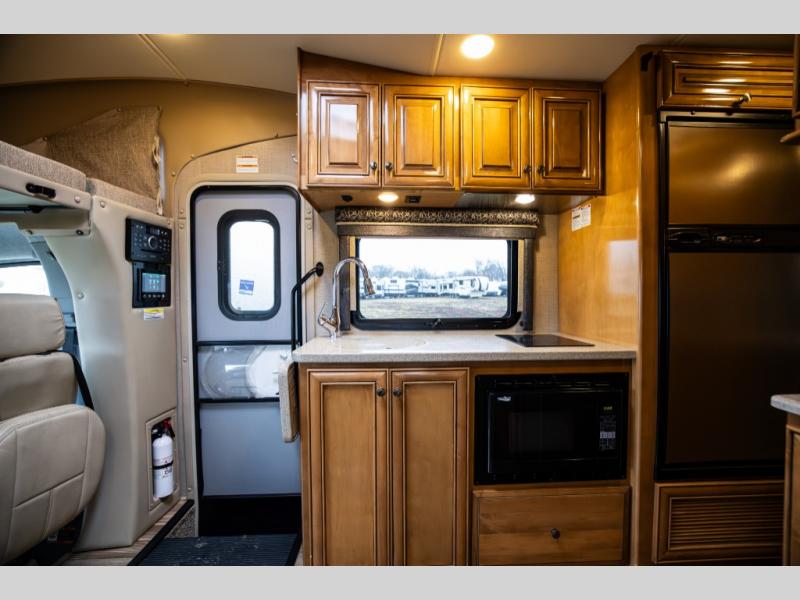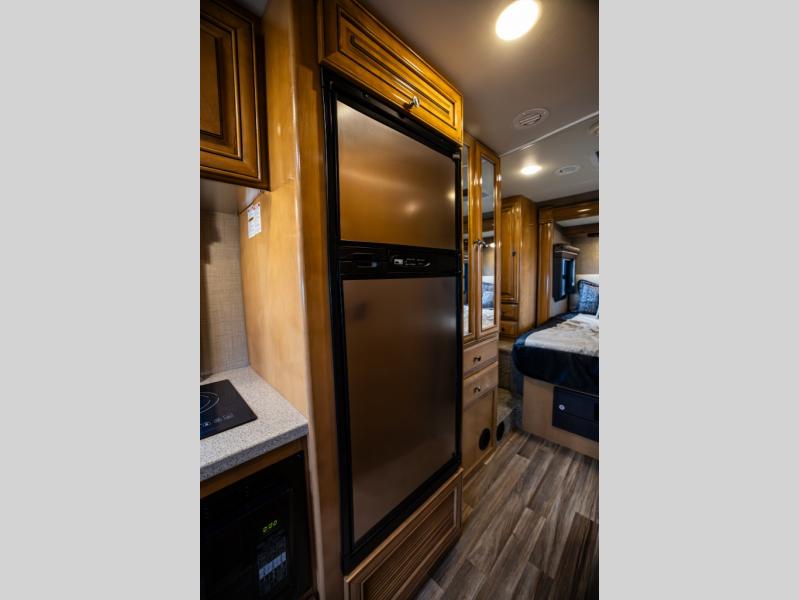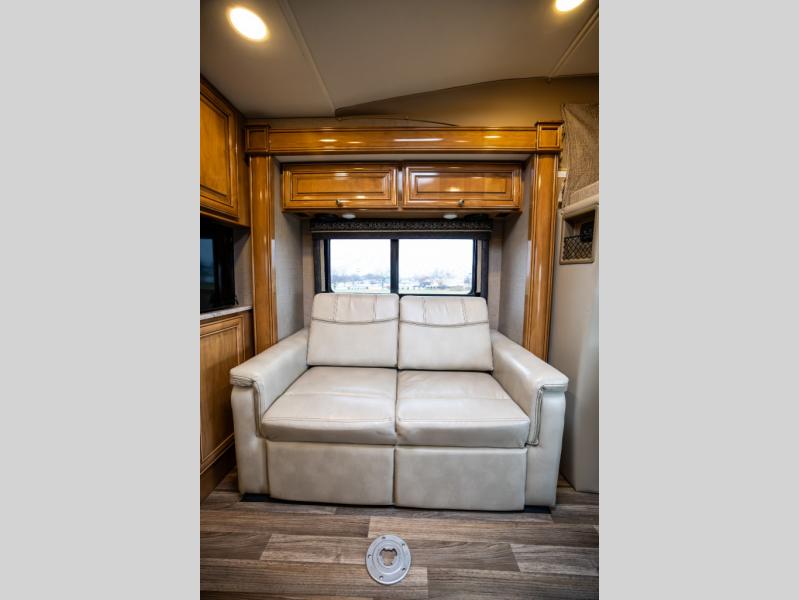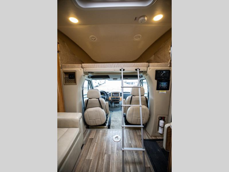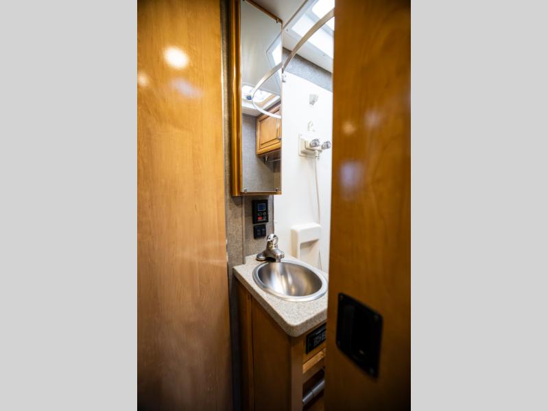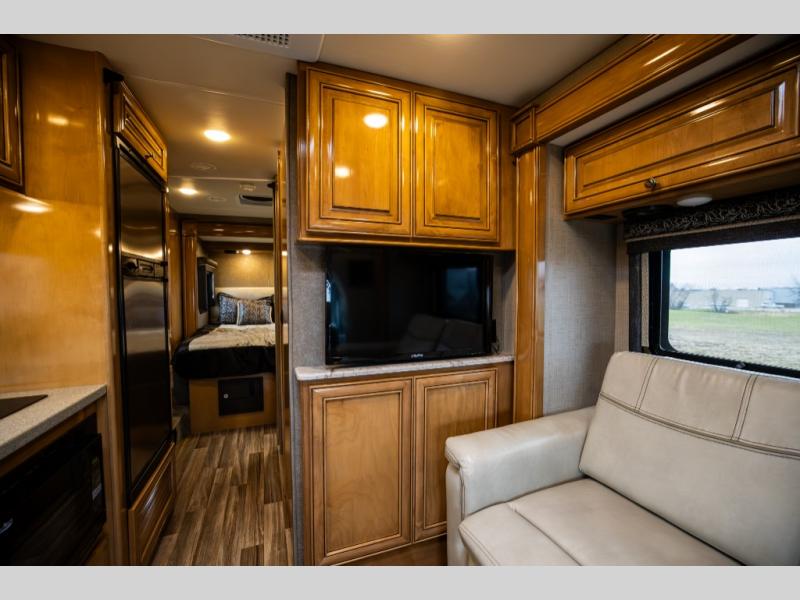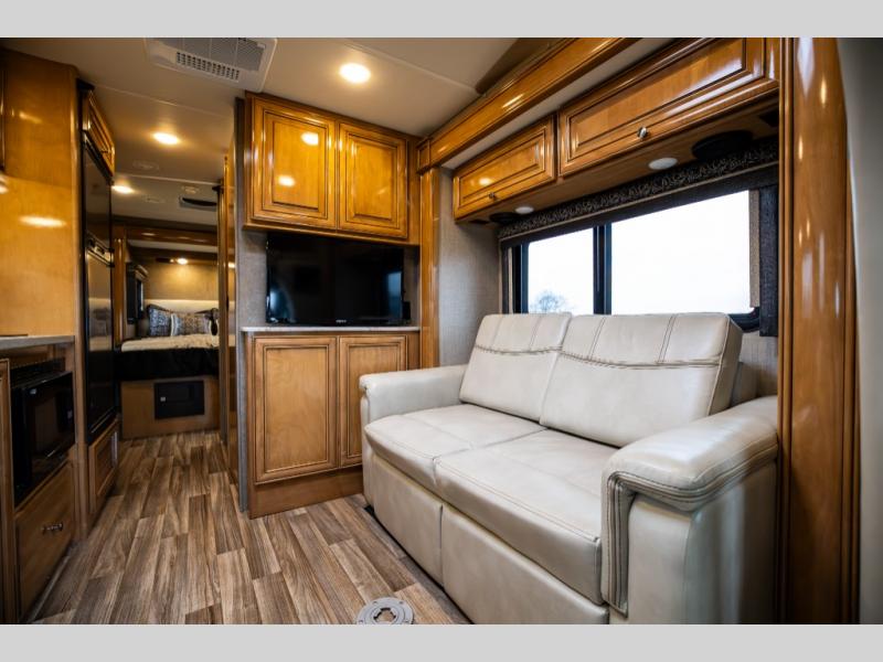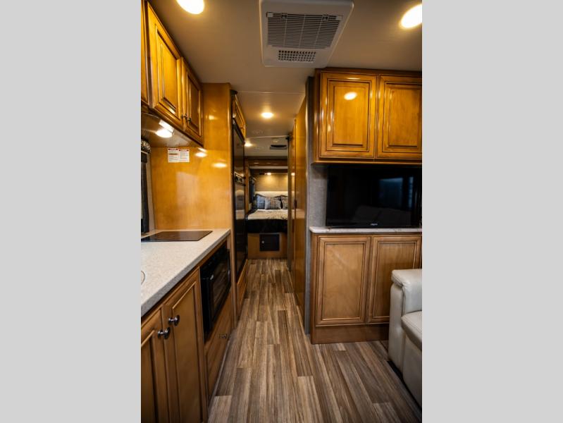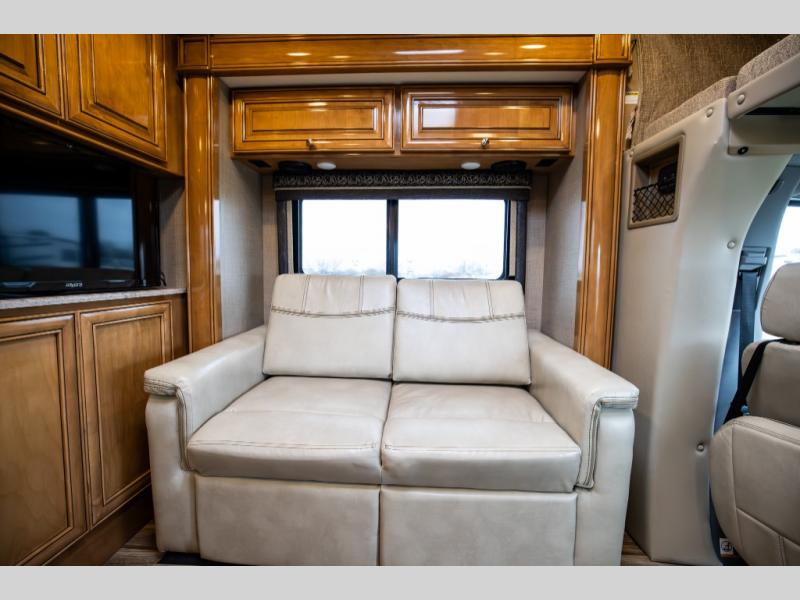 As you enter this model, above the cab you will find a 36" x 75" sleeping space for one adult or a child. The slide out located behind the driver's seat has a sofa bed and a removable pedestal table. At night the sofa converts into additional sleeping space. Adjacent to the slide you can enjoy watching movies at the 32" LED TV.