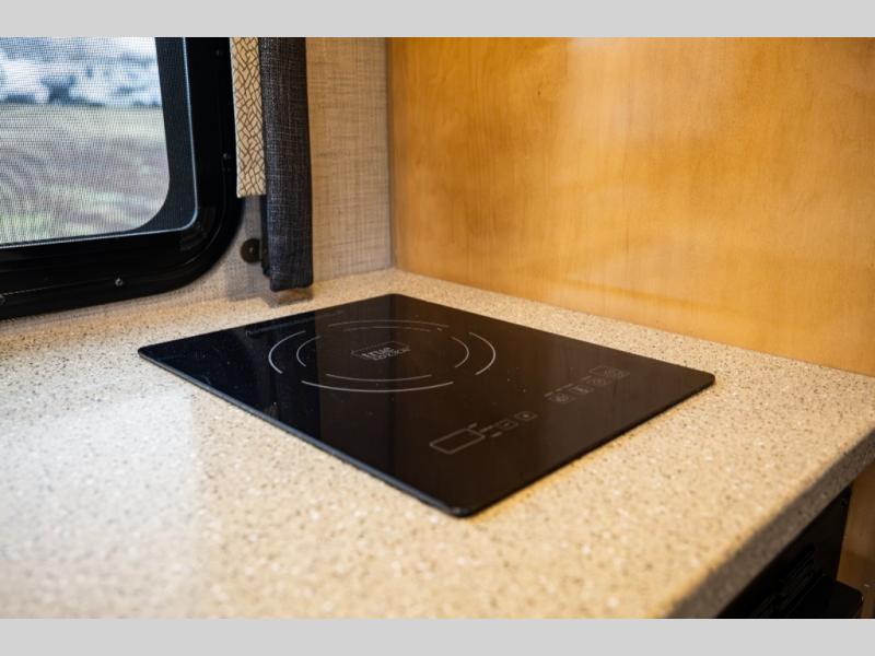 To the left of the entry door there is a flip-up counter top, a round sink, an induction single burner, a microwave, overhead cabinet for dishes, and a refrigerator. There is also a handy closet for clothing or extra linens as it is opposite the full bath.