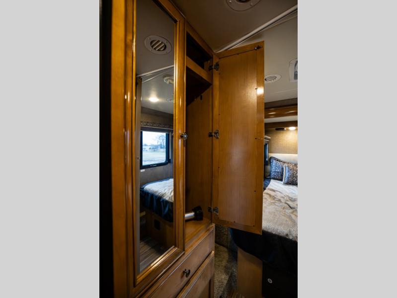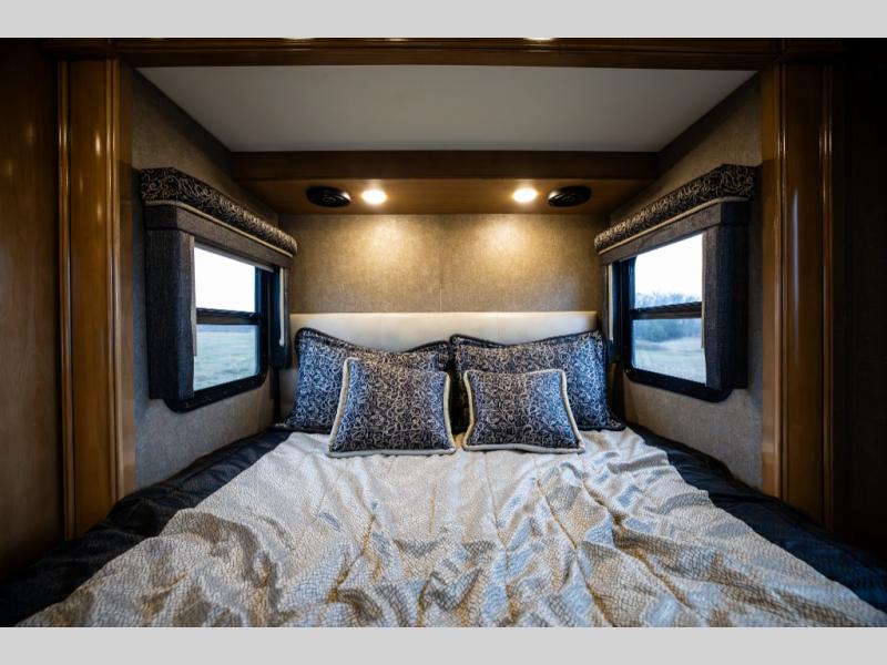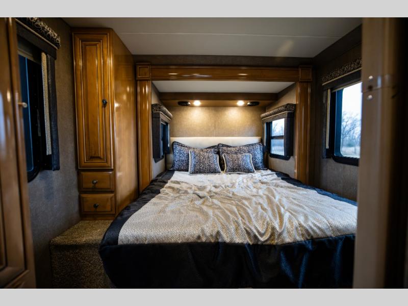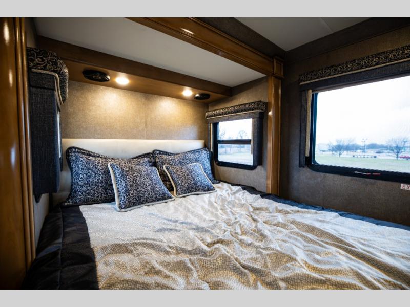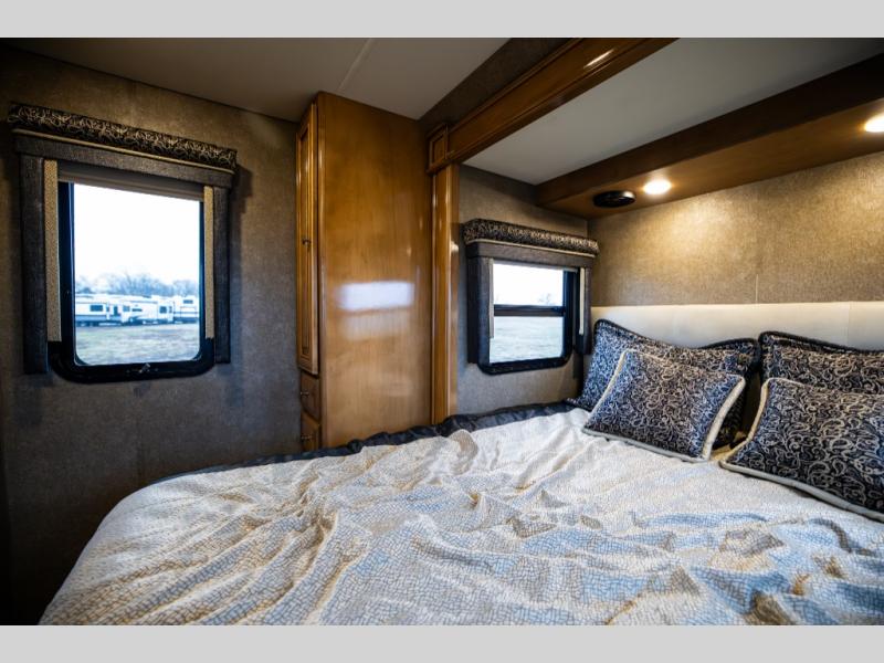 Located in the rear of this motor home is the bedroom with a rear slide out queen bed including overhead storage, and a 32" LED TV on the interior wall. The bed is a step up from the main part of the coach.