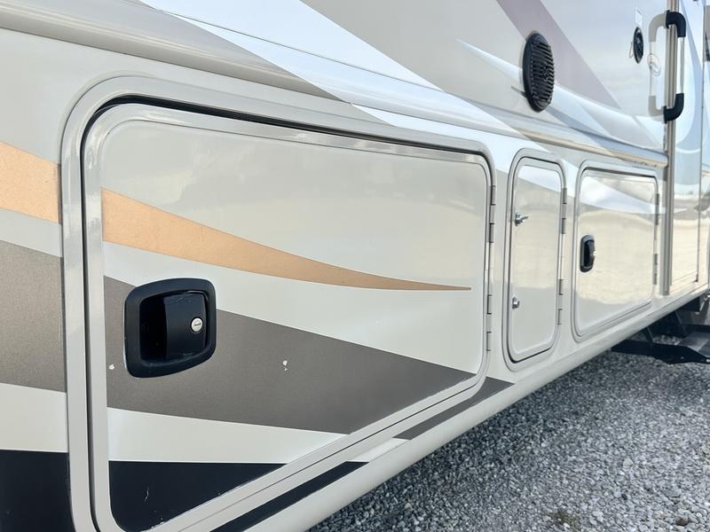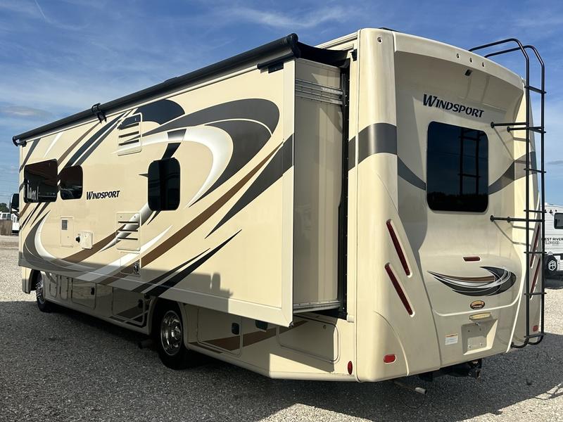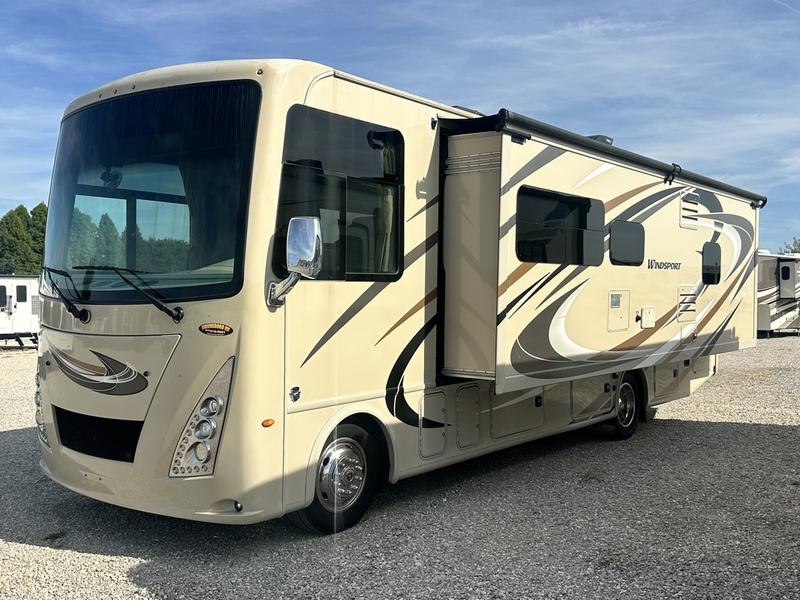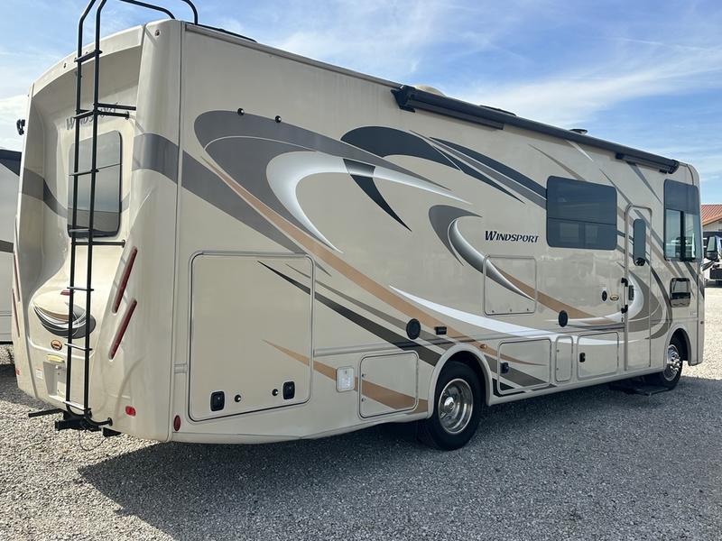 You will find much to love about all Windsport models whether you are out for a long road trip across the country, or a weekend tailgating party close to home. All Windsport models feature Leatherette furniture, solid surface countertops, and raised panel upper cabinet doors with nickel finish hardware and glass inserts on select doors. You will also find added sleeping space in the drop-down cabover bunk that the kids are sure to love. With the swivel and reclining captain's chairs you can easily bring them into a conversation area in the living space once parked, and there is a dash workstation with 110-volt and 12-volt outlets at the passenger side for those who need to do a bit of work while traveling, or for those who just enjoy surfing the internet. On the outside, enjoy Robocast storage compartments, an outdoor shower, plus a 32" LED TV on a manual swivel, and a legless lateral power awning with integrated LED lighting. Make any Windsport class A gas motor home by Thor Motor Coach your new home-away-from-home today!