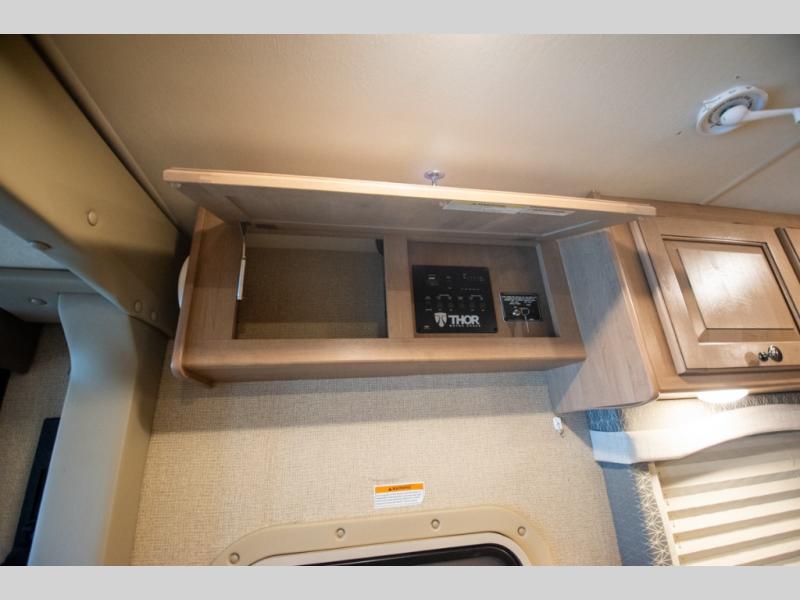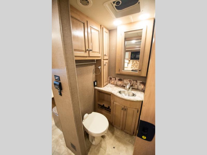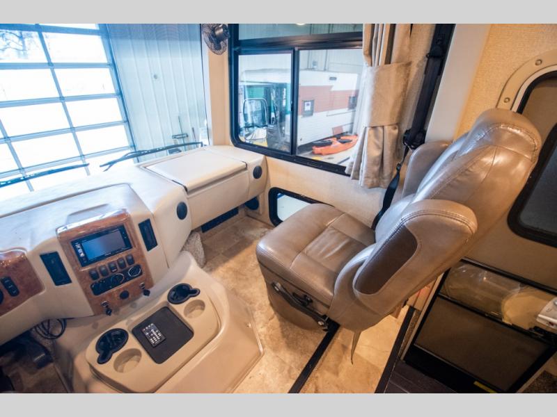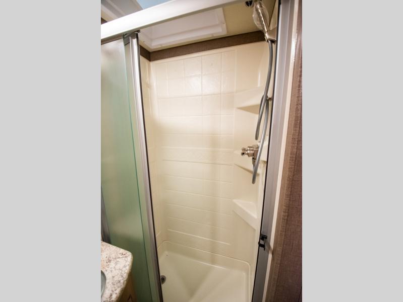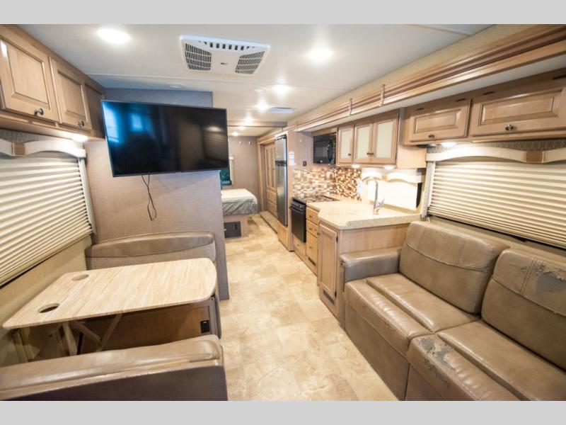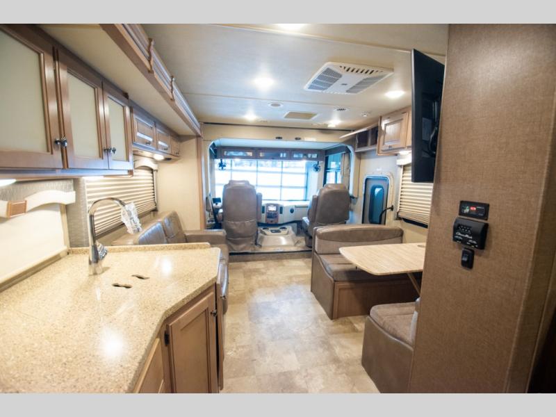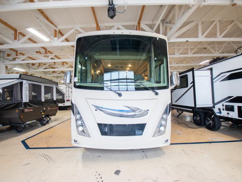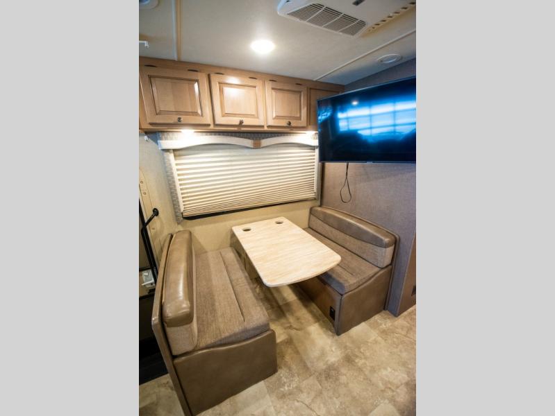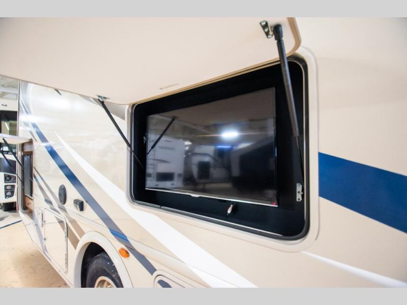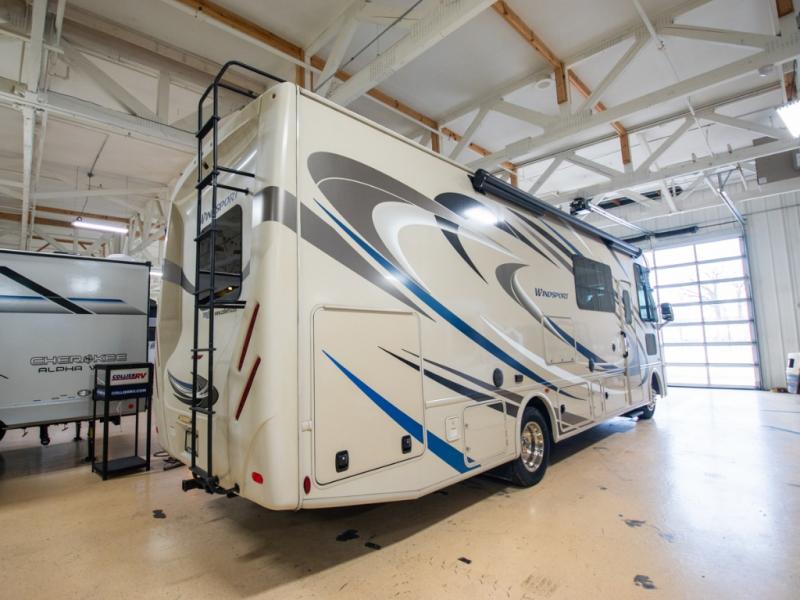 You will find much to love about all Windsport models whether you are out for a long road trip across the country, or a weekend tailgating party close to home. All Windsport models feature Leatherette furniture, solid surface countertops, and raised panel upper cabinet doors with nickel finish hardware and glass inserts on select doors. You will also find added sleeping space in the drop-down cabover bunk that the kids are sure to love. With the swivel and reclining captain's chairs you can easily bring them into a conversation area in the living space once parked, and there is a dash workstation with 110-volt and 12-volt outlets at the passenger side for those who need to do a bit of work while traveling, or for those who just enjoy surfing the internet. On the outside, enjoy Robocast storage compartments, an outdoor shower, plus a 32" LED TV on a manual swivel, and a legless lateral power awning with integrated LED lighting. Make any Windsport class A gas motor home by Thor Motor Coach your new home-away-from-home today!