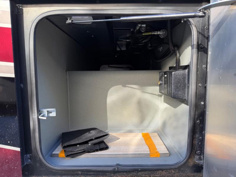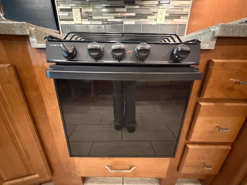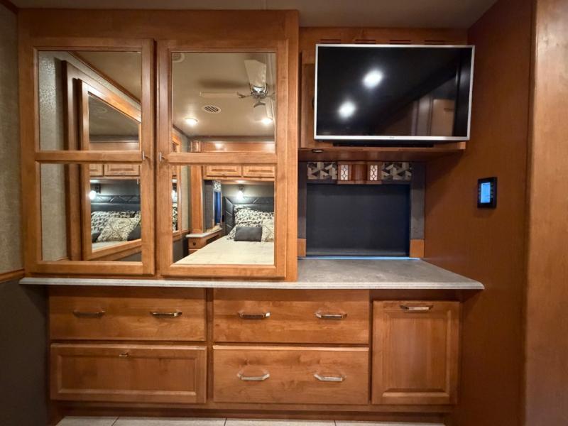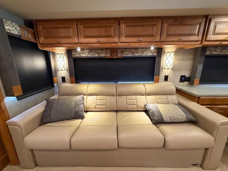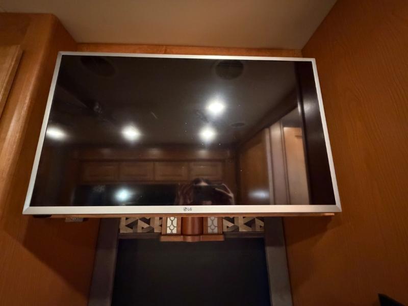 On the right side find a slide out booth dinette and sofa bed with overhead cabinet. You can even choose to have an optional dinette with a computer station and an L-shaped chaise sofa bed with coffee table. A standard TV is mounted along the outer bathroom wall for perfect viewing from any seating in the room, also you can add an optional fireplace for those chilly evenings!