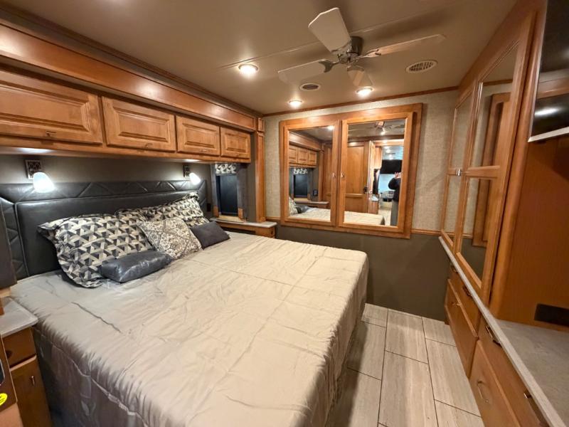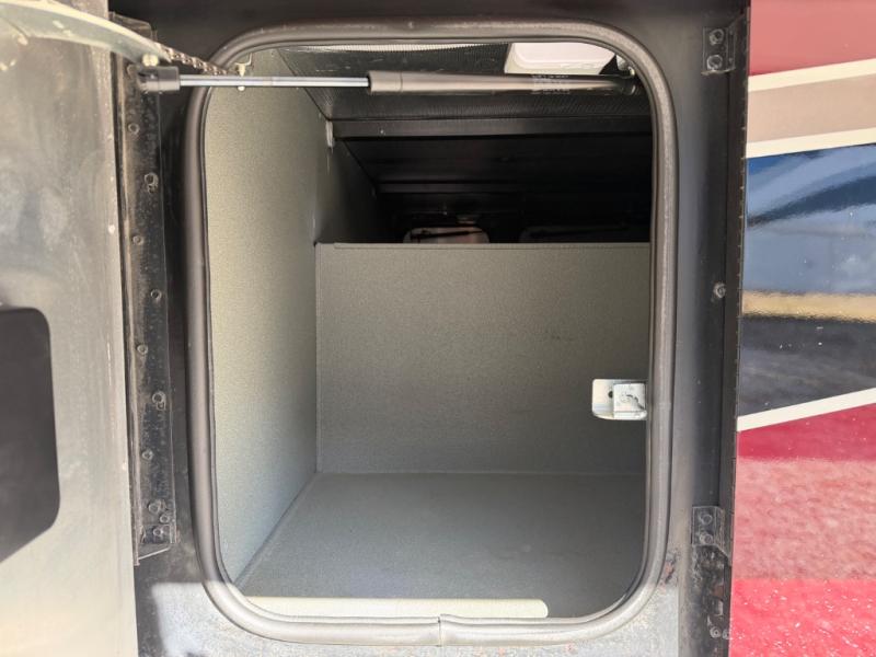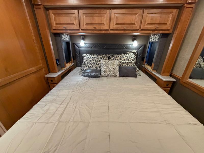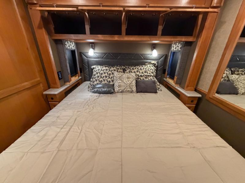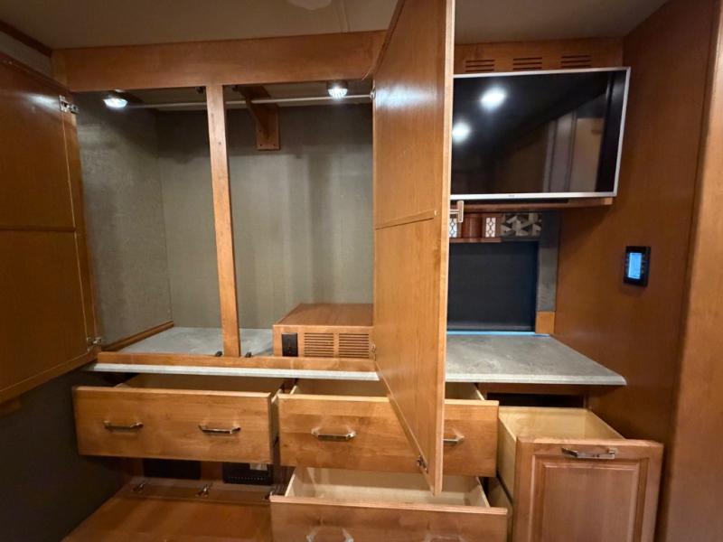 Continue on back to the master bedroom where you will enjoy a relaxing retreat with plenty of space. There is a king bed slide out including nightstands on both sides. A rear wall storage space, and opposite the bed there is a wardrobe with drawers, and vanity with TV, plus so much more!