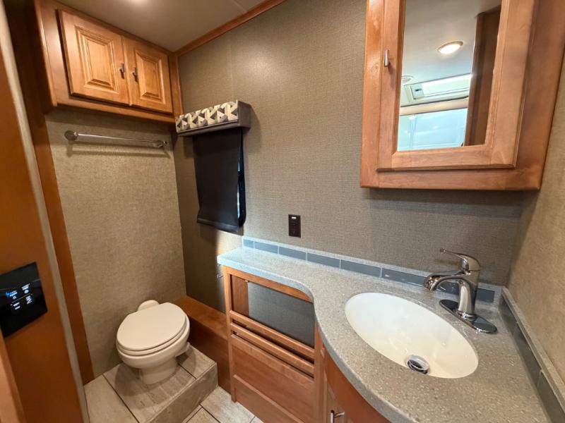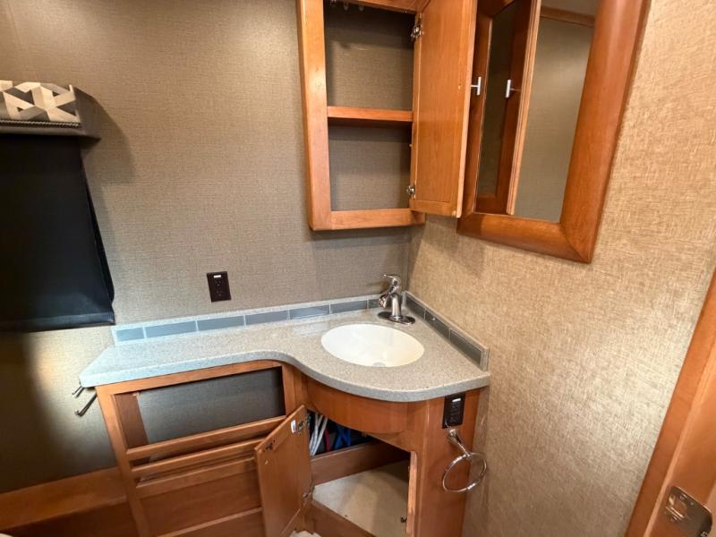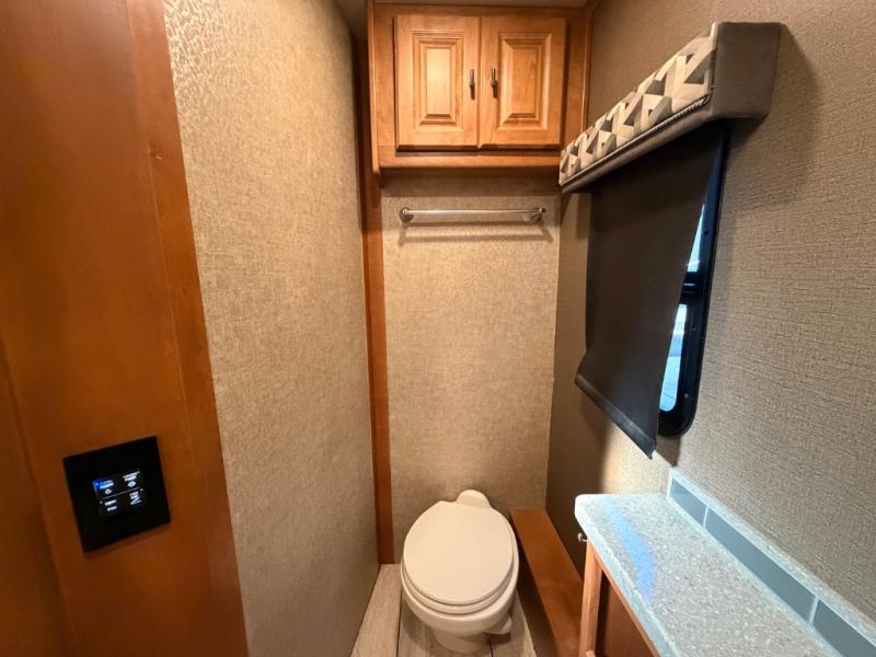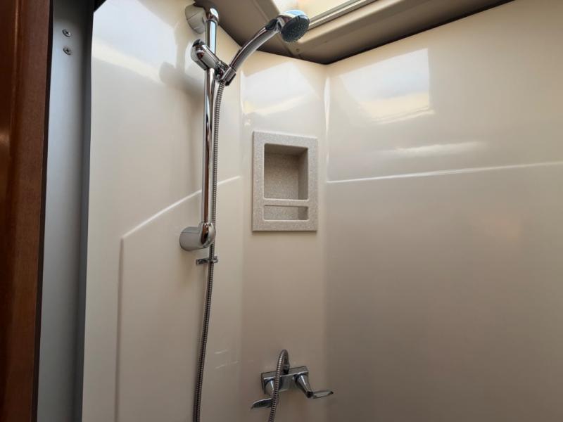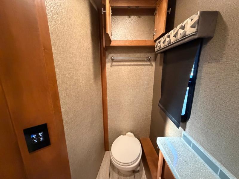 A sliding door blocks off the bedroom and bathroom space from the front living area. When you enter you will find a shower on your right and private toilet and vanity with sink on your left including some overhead storage cabinets.
