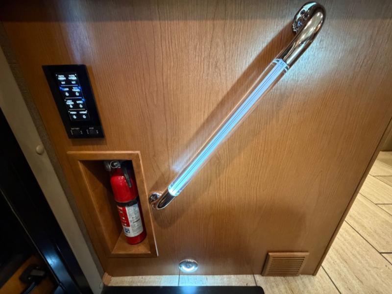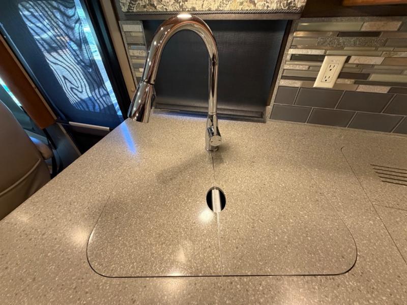 Enter the side door behind the passenger seat. Once inside take a look back and see just how spacious the interior is. There is a double sink, three burner range with microwave overhead, refrigerator, and pantry along the curb side just beyond the entry door. So, cooking your favorite gourmet meals will be a cinch!