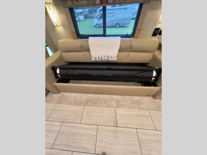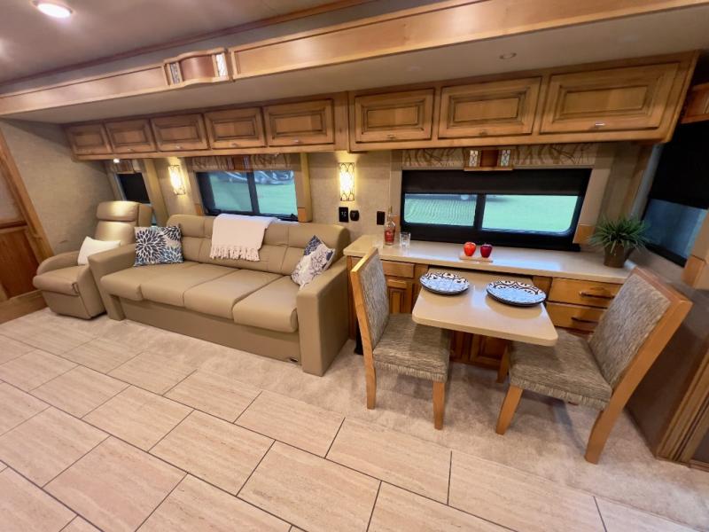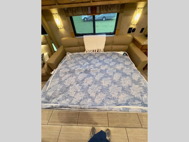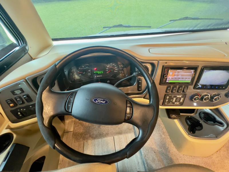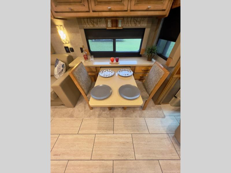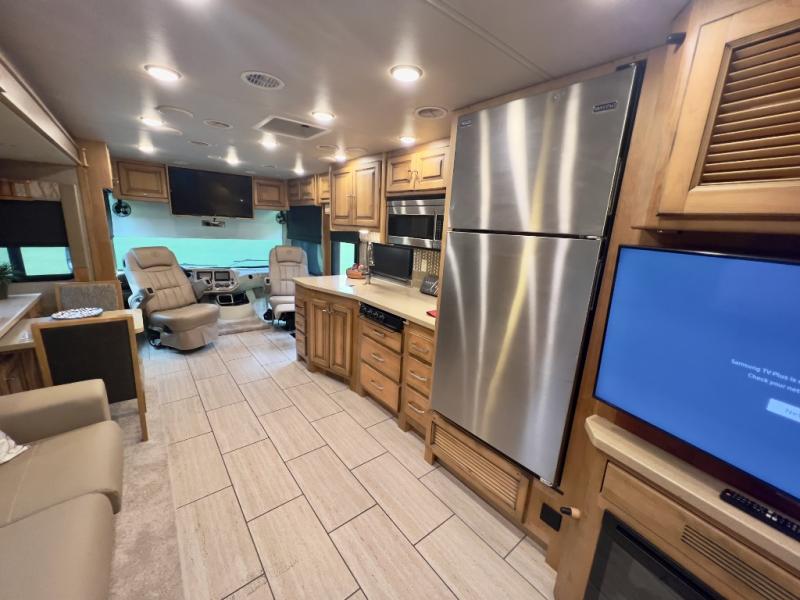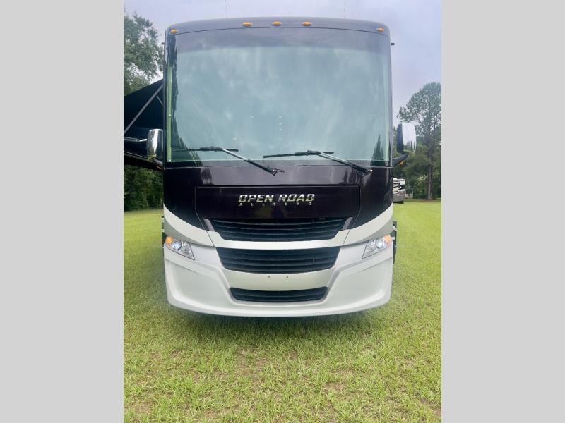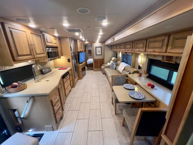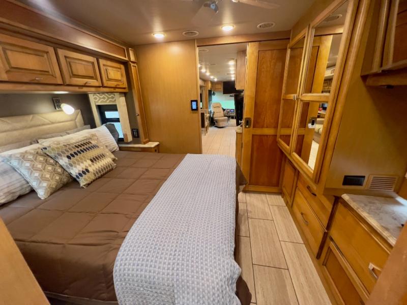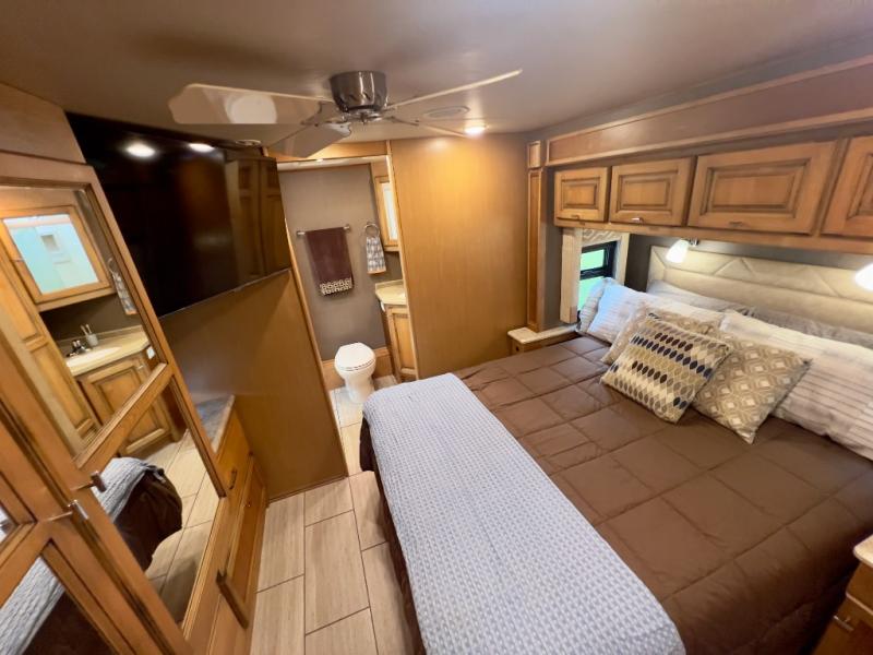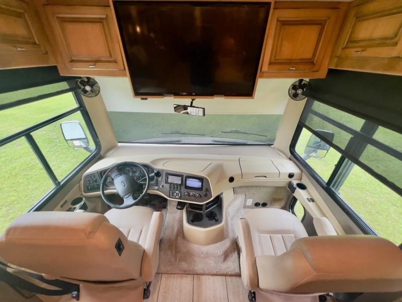 Step into this Allegro 36 LA class A motorhome to find two captain's chairs and overhead cabinets at each side in the front of the coach. There is also a TV above the cab for your viewing pleasure.