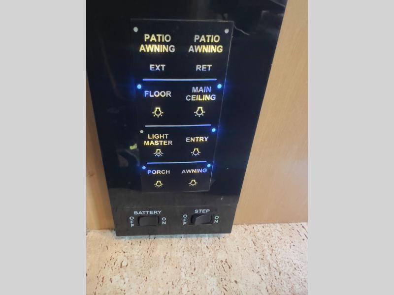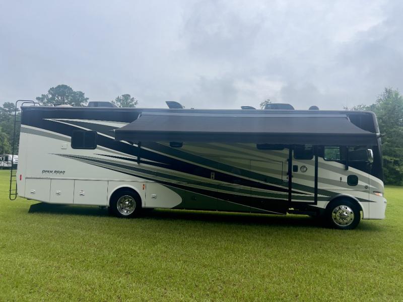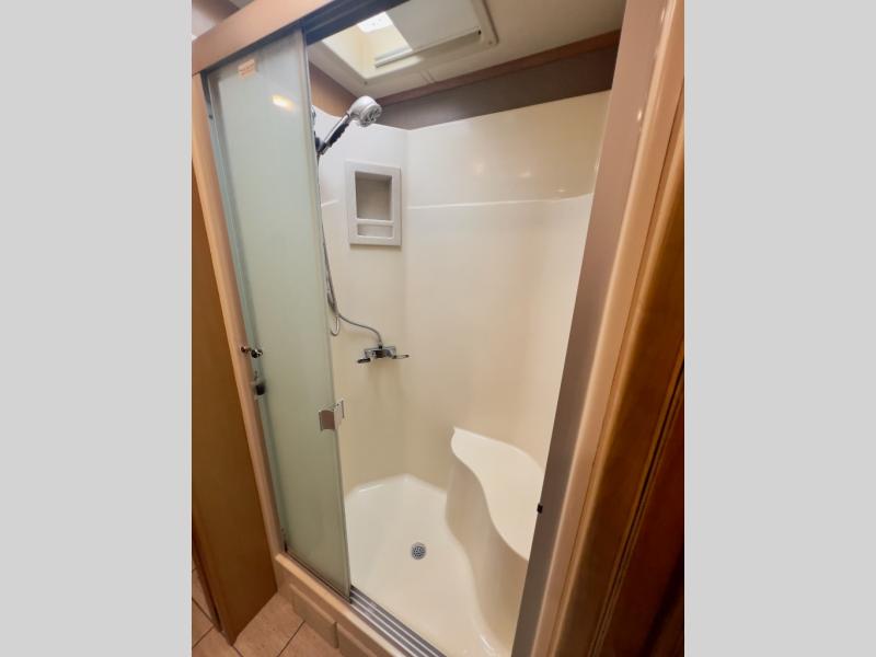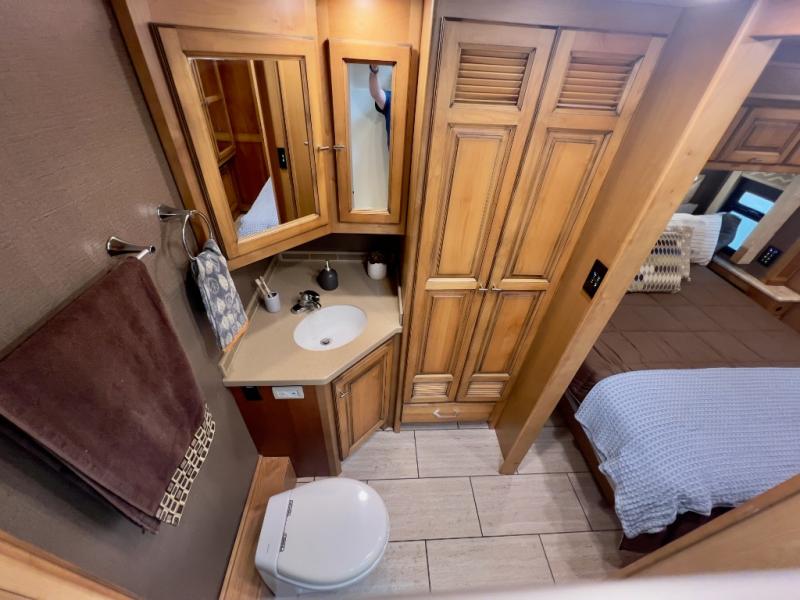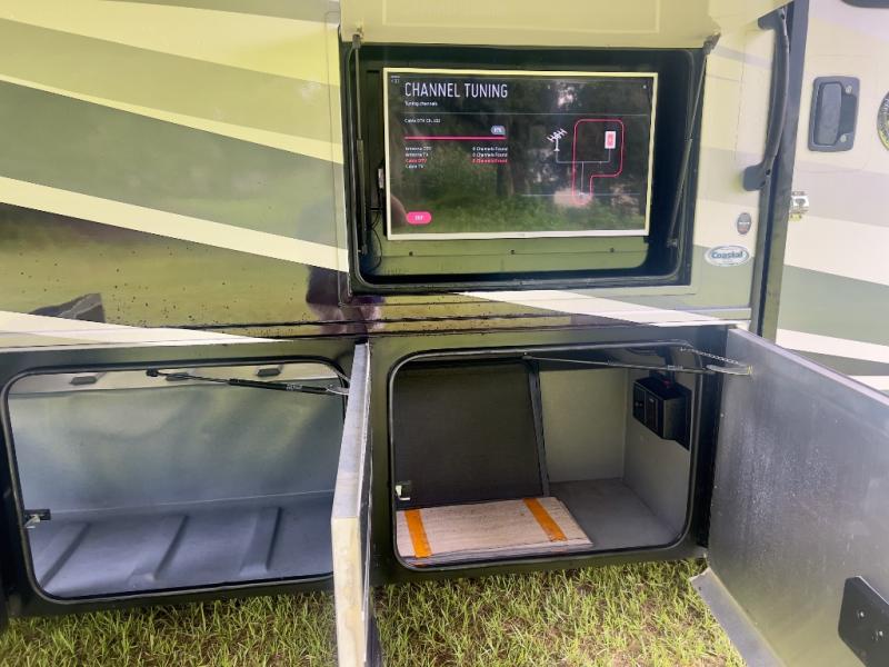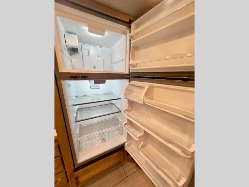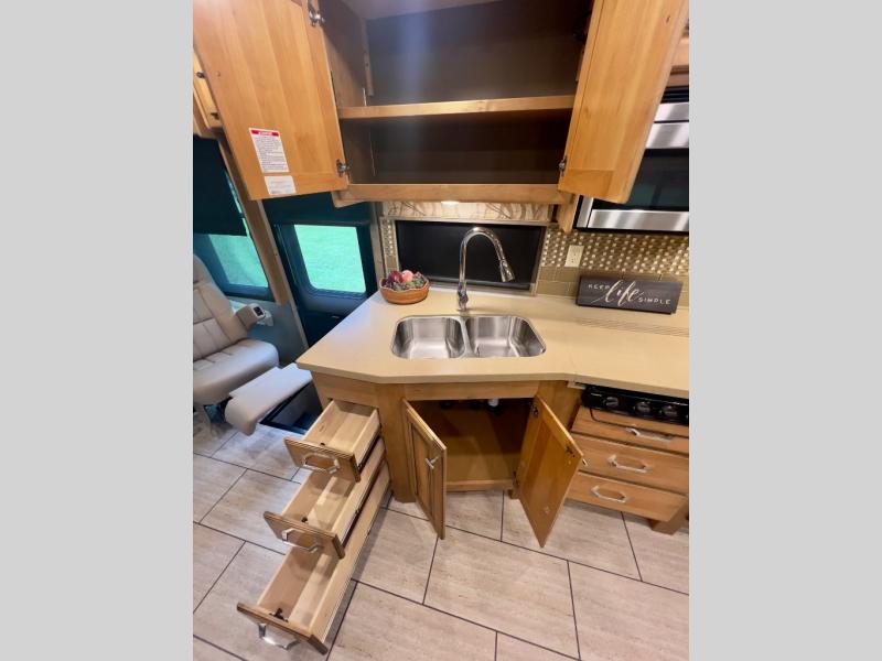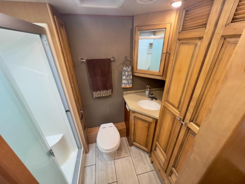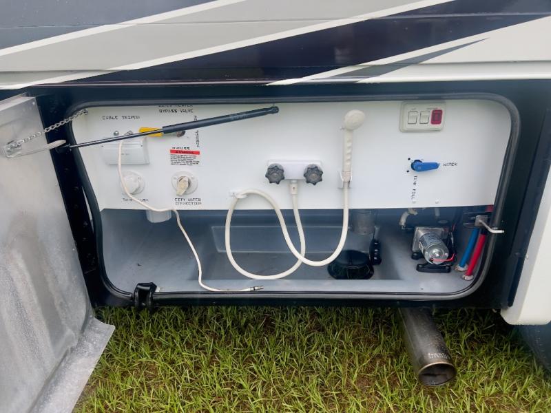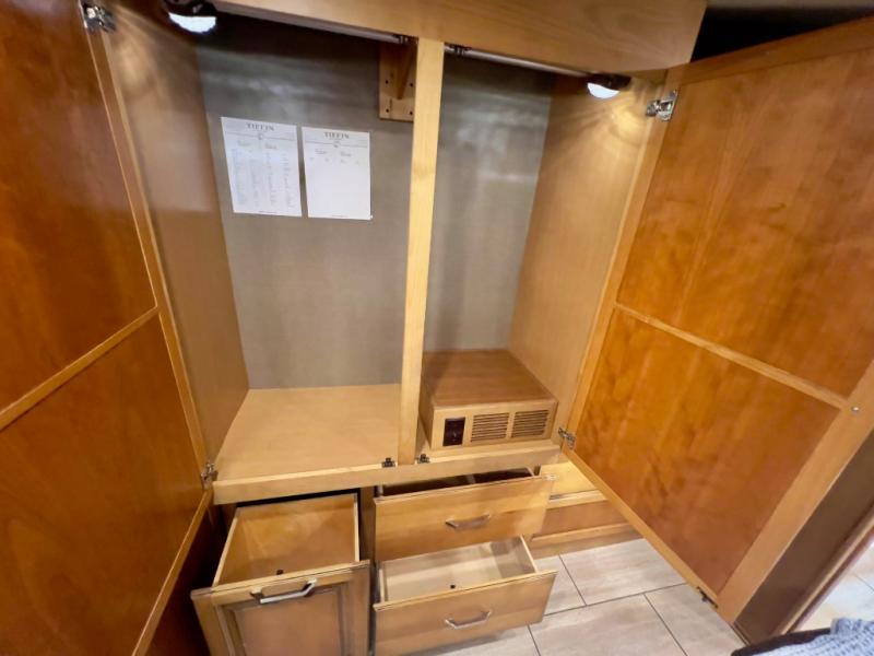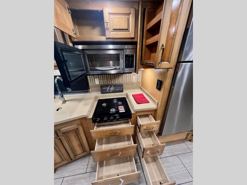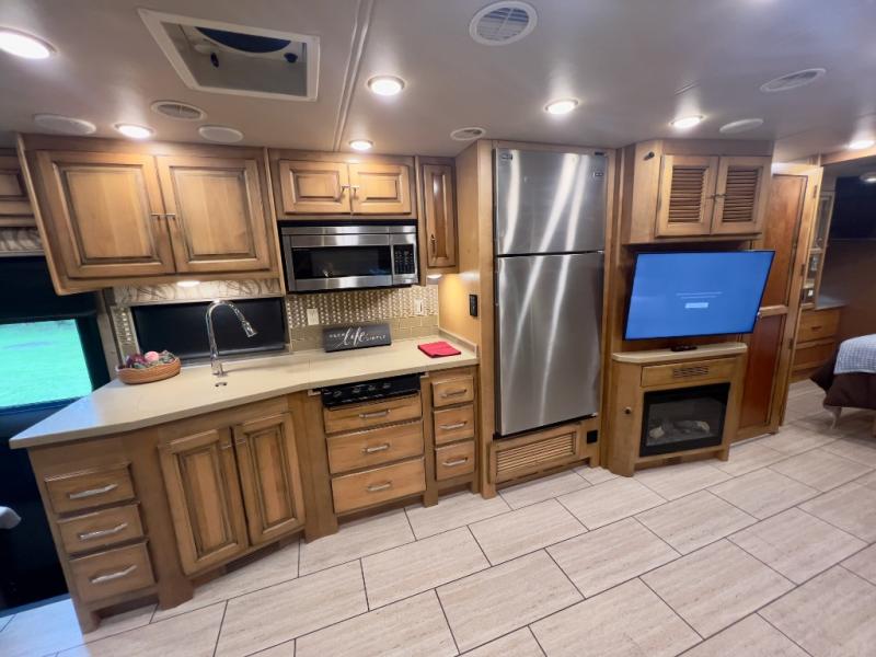 Step into this Allegro 36 LA class A motorhome to find two captain's chairs and overhead cabinets at each side in the front of the coach. There is also a TV above the cab for your viewing pleasure.