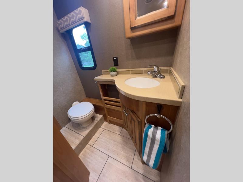 The rear bathroom provides lots of overhead cabinets, a corner shower, a toilet, a large corner vanity and sink as well as the option for under counter combo washer/dryer, and more!