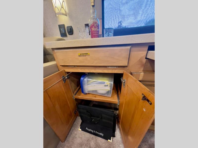 The roadside offers a large slide out which has a booth dinette, sofa bed, lounge chair, and overhead cabinets. You may choose an optional dinette with a computer workstation or an optional L-shaped chaise sofa bed.