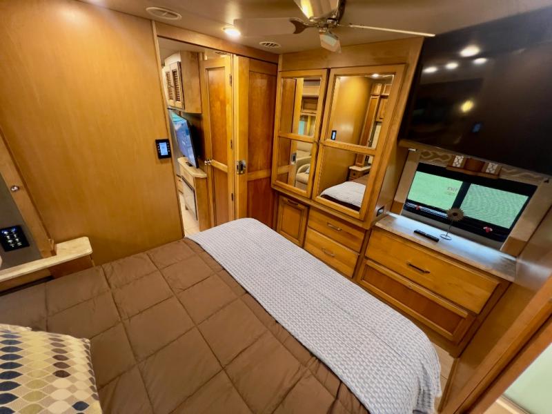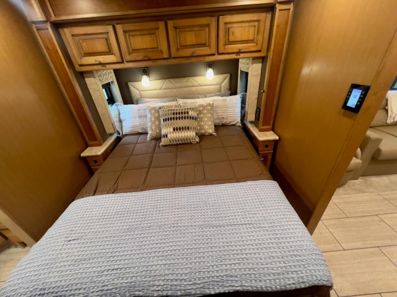 The private bedroom includes a queen bed slide out with nightstands at each side and overhead cabinets. The wall opposite the bed has a wardrobe with drawers below as well as a cabinet and a TV.