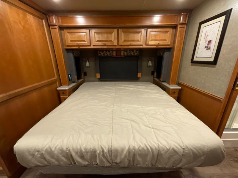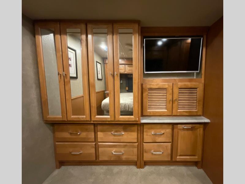 The bedroom features a king size bed slide out with nightstands and overhead cabinets along the curb side. A wardrobe with drawers below and a cabinet with a swivel TV above are on the opposite side of the bed inside the full wall slide out along the road side.