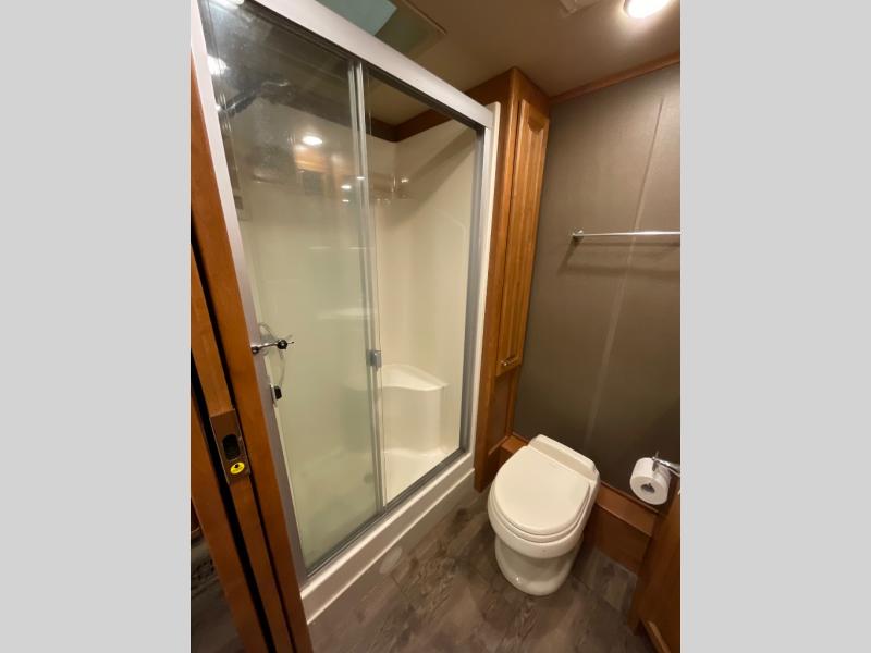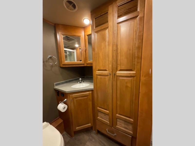 This class A gas motorhome includes a full rear bathroom with a sliding entrance door. There is a corner vanity with sink and overhead cabinet, a shower, linen storage, and a toilet.