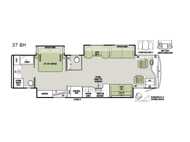 The slide out along the roadside features a sofa with an overhead cabinet and a booth dinette. Both the sofa and dinette provide additional sleeping space at night, if needed. You can choose an optional u-shaped booth dinette or a dinette with a computer workstation.