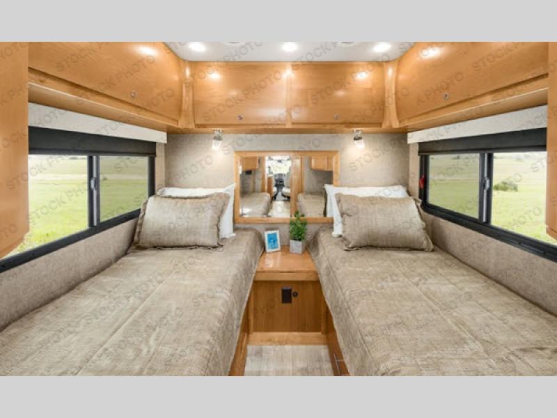 This Wayfarer 24 TW class C diesel motorhome provides access to the shower separately from the private toilet and vanity with sink which is quiet convenient when you are in a hurry to head into town. And if you prefer your own wardrobe, this unit allows for his and hers clothing along separate sides of the coach, one for each twin bed. The dual opposing twin beds convert to a king size bed if you need more sleeping space on any given night. And the loft bed over the cab provides additional sleeping space for your kids or overnight guests. You will find four seatbelts, kitchen amenities, plus more. Stop looking around for the perfect motorhome, you have found it!