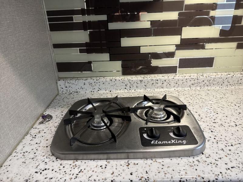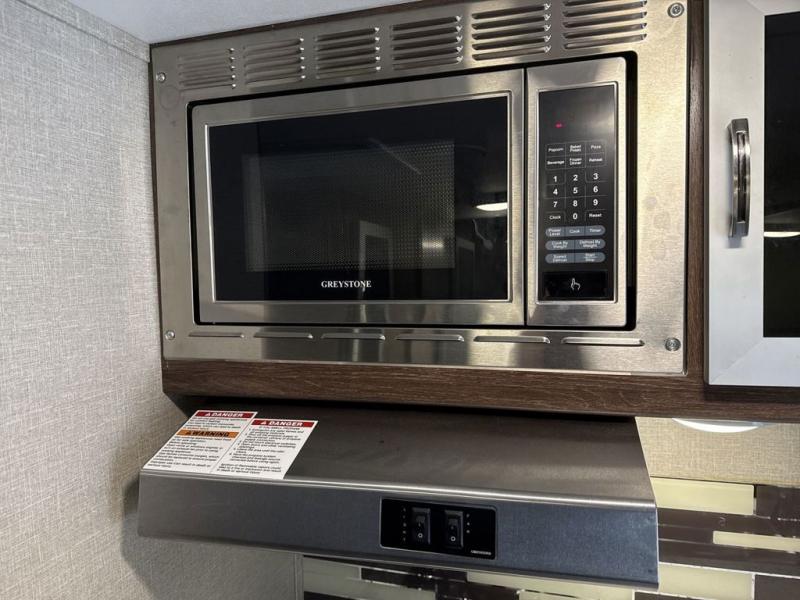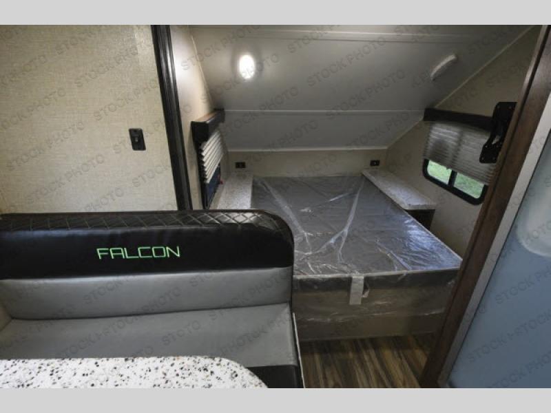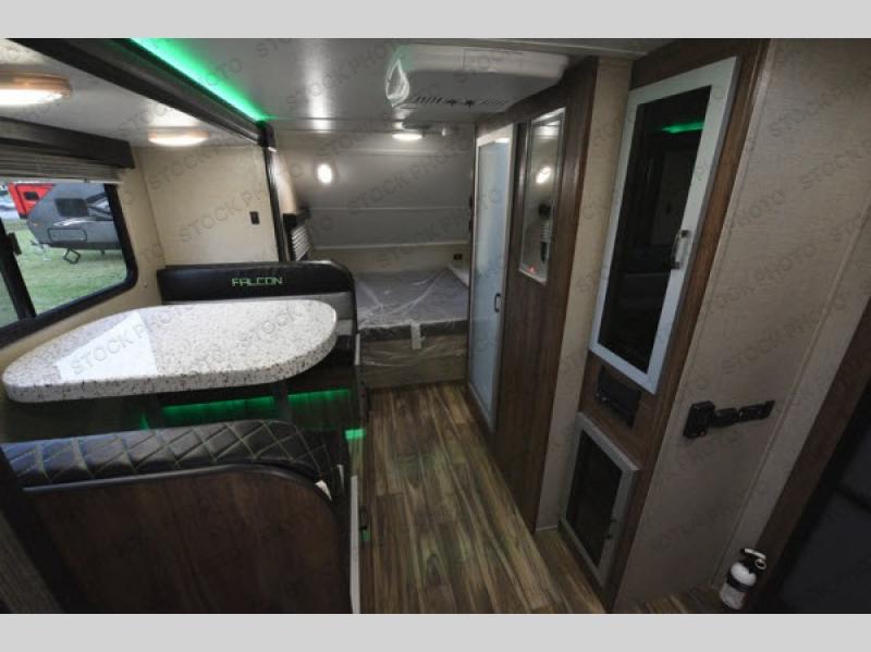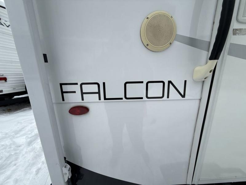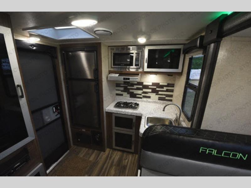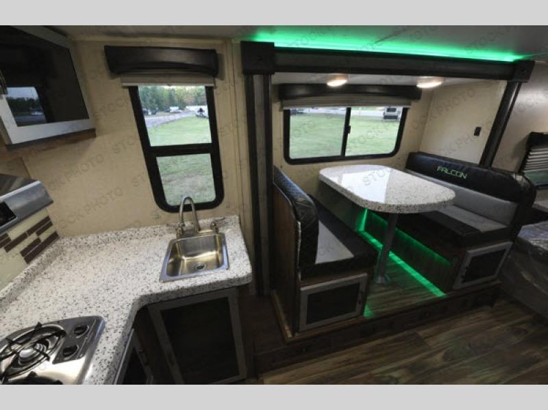 This Falcon F-22RK is the ideal couples trailer! With a rear kitchen and a front queen bed with storage below you will have everything that you need at your fingertips! There is a bit more floor space throughout this model thanks to the slide out along the roadside, plus you will find that the fully equipped rear kitchen is easy to use! Enjoy your meals at the dinette and at night you can easily convert this area into additional sleeping space! This unit also features a front bedroom with a queen size bed, plus there is a handy wet bath. Along with all of the standard features you can also choose the Eclipse Package, Fire Package, or the GT Package!