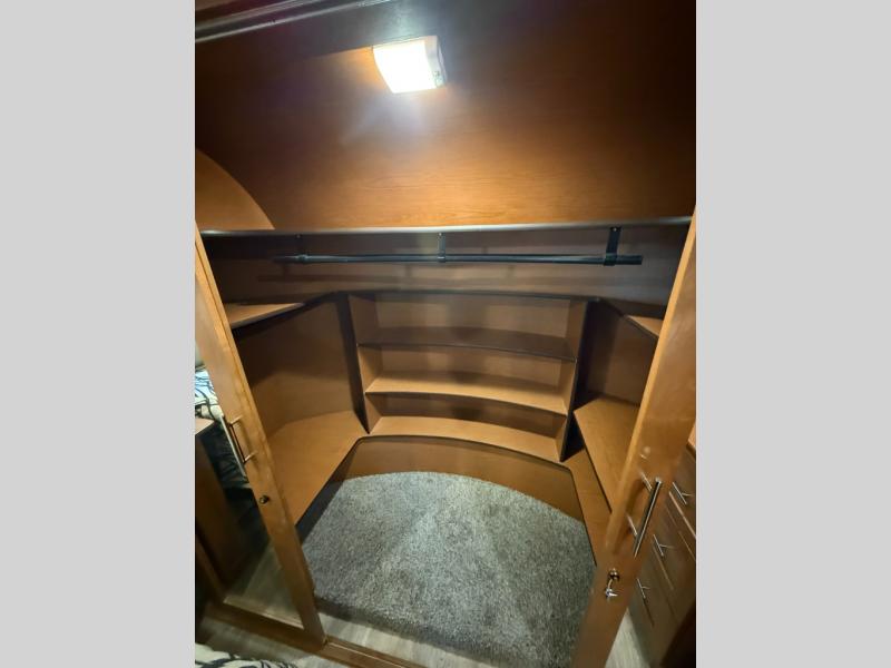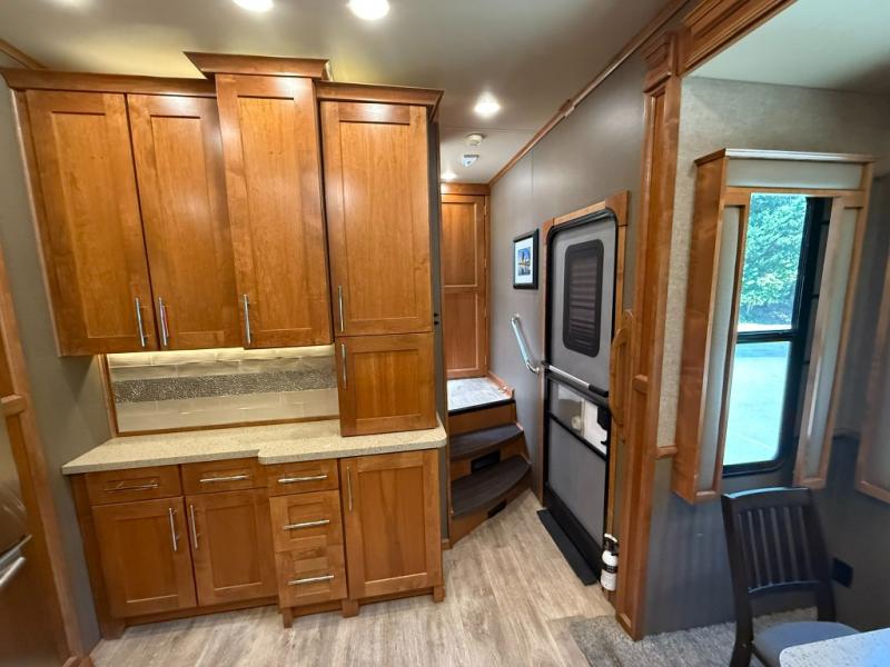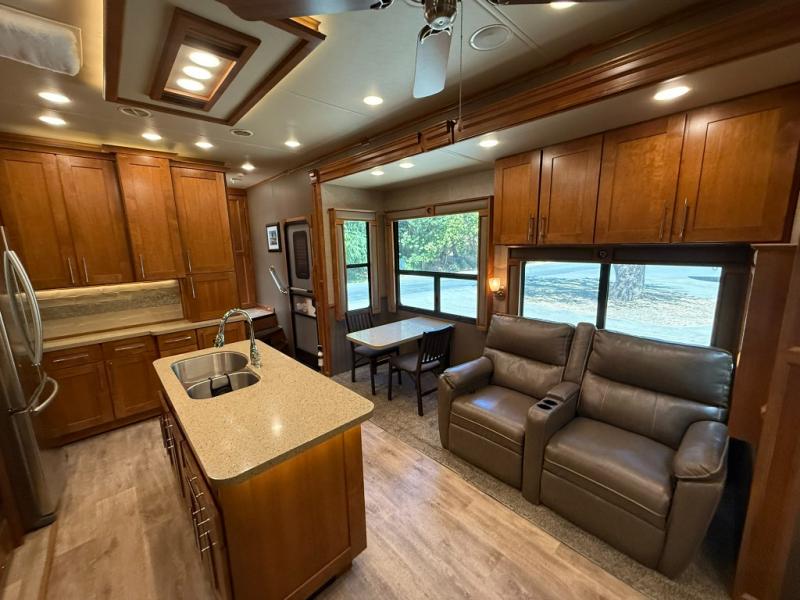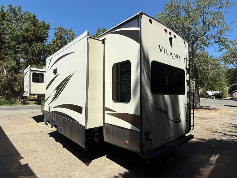 Space, space, and more space is what you will find in this at-home luxury Vilano 325RL fifth wheel. In the combined kitchen and living area there are dual opposing slide outs, a kitchen island with extra counter space, plus a large pantry for your food storage. Come relax at the 80" sofa bed or at the 58" theater seats. In the evening you can enjoy a fire in the fireplace. At night head up the stairs to the front bedroom where you will find a queen bed plus a large front wardrobe for all of your clothes and more!