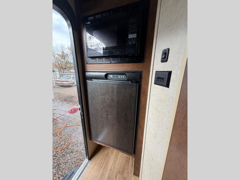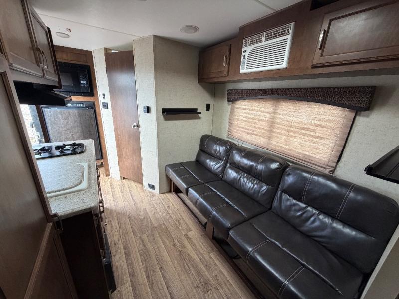 Looking for a cozy couples travel trailer with extra sleeping space for an overnight guest on occasion? Just imagine hitching up this Sonic Lite and heading to the state park. You will be able to make meals in a convection microwave if you want a hot meal rather than eating cold sandwiches all weekend. You can dine and relax on the sofa with free standing dinette table as well as play games, and fold down the sofa for a guest. There is a full bathroom, plenty of storage, and an awning outside. Take a look today.