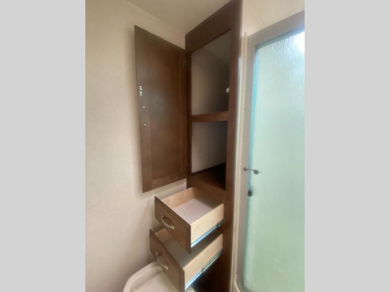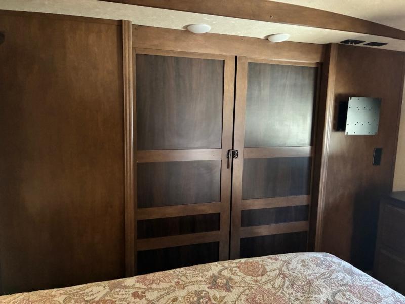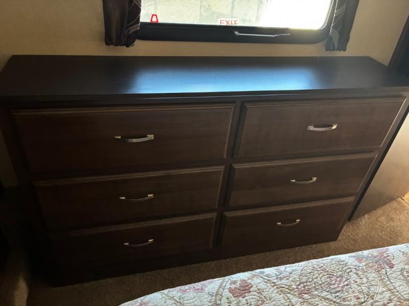 Retreat to the front bedroom and enjoy a custom king bed with shelf which is on a slide. Across from the bed there is ample storage with the dresser, and along the front of the room find a wardrobe with shelf.