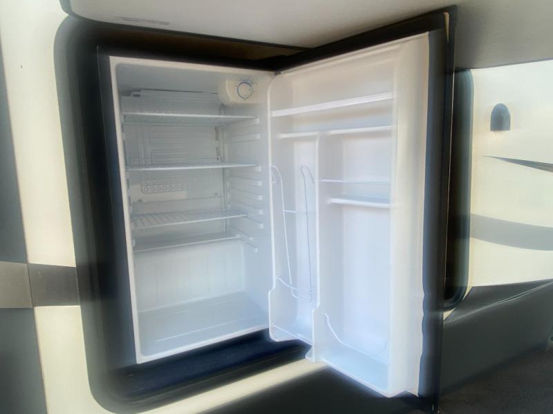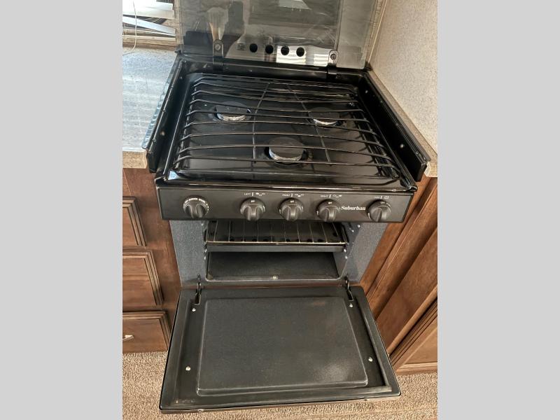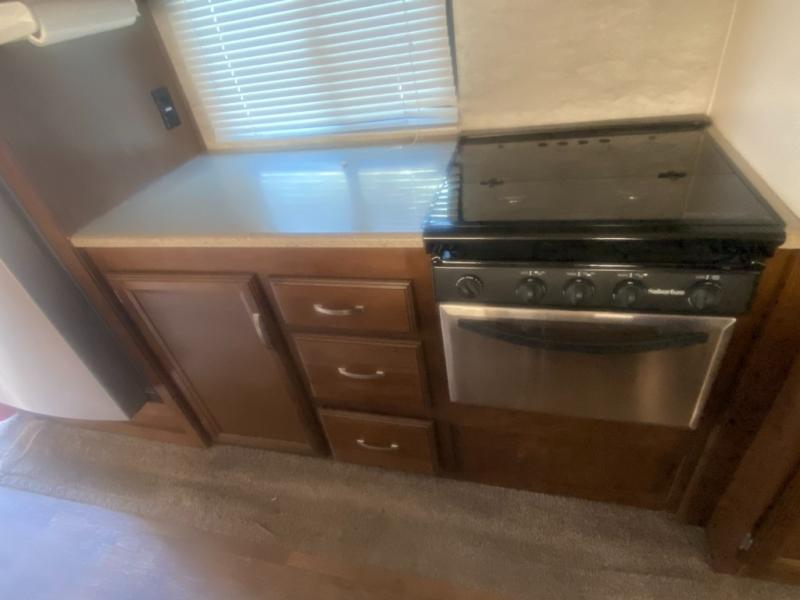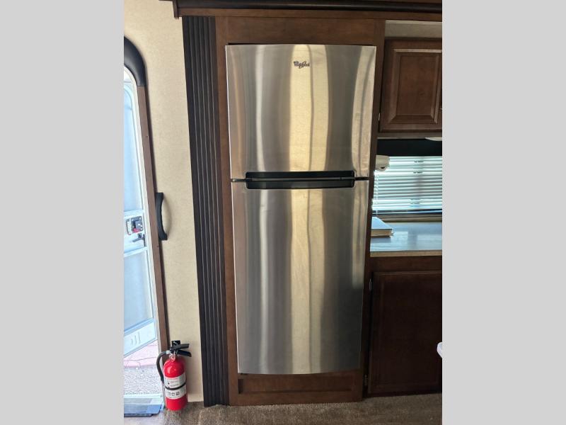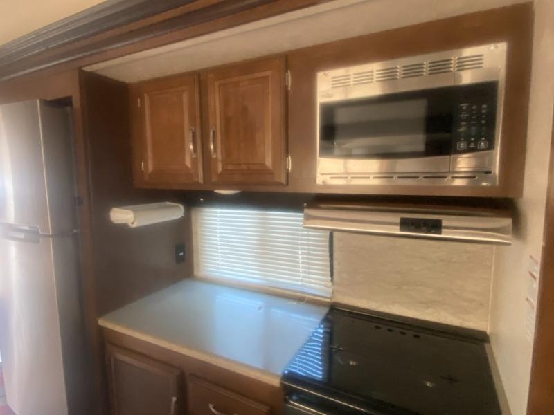 In the kitchen and living room there are dual opposing slides which help to open up the living space. The first slide has a refrigerator, counter space, overhead cabinets, three burner range, microwave, pantry for your canned goods, plus an entertainment center and fireplace. Along the rear wall you will find a tri-fold sofa, end tables, and more overhead cabinets.