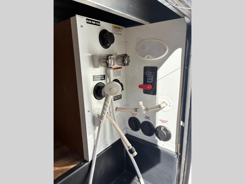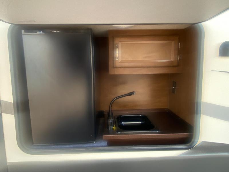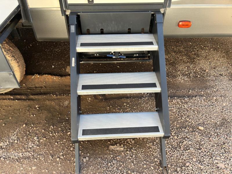 Outside you will find an awning and large pass through storage for your outdoor gear. Plus you can choose to have an optional exterior kitchen which features an overhead cabinet, sink, and an electric refrigerator. There is also an optional swivel gas grill and more!.
