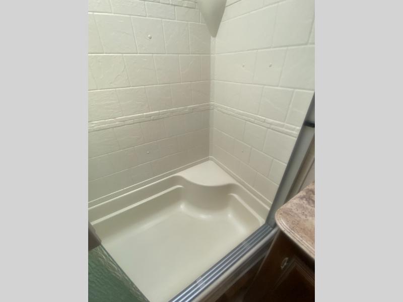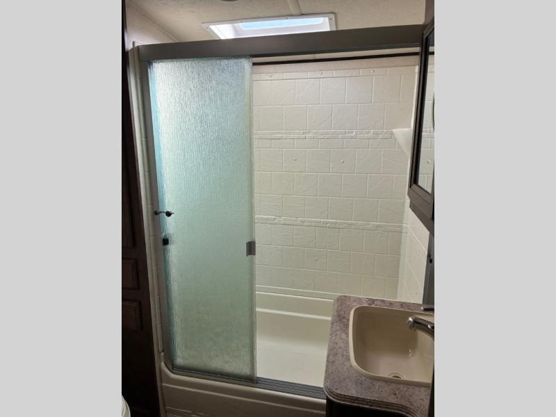 Step up to the bathroom and bedroom area. In the bathroom you will find a toilet, large linen cabinet, residential tub/shower with seat, sink, and medicine cabinet.