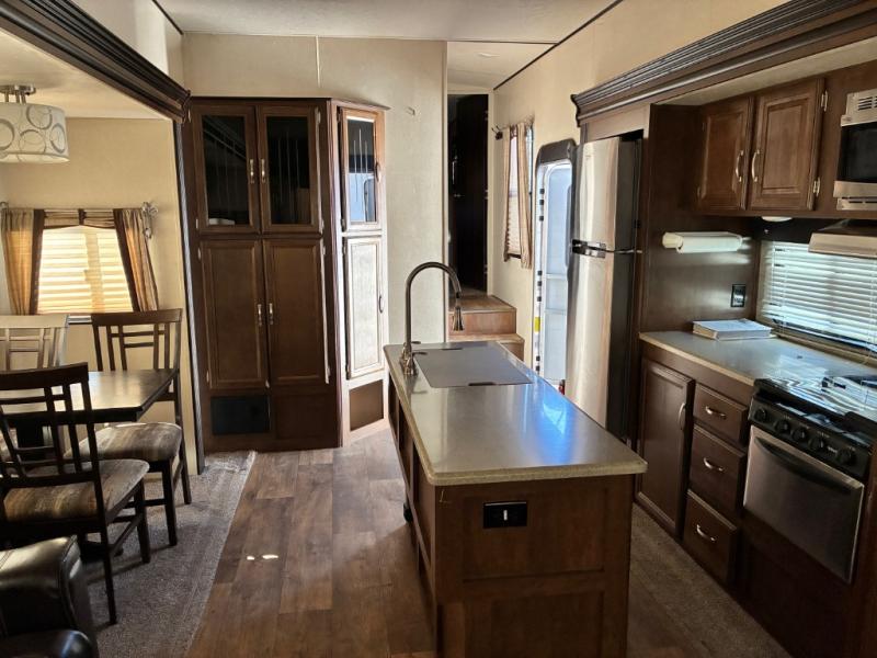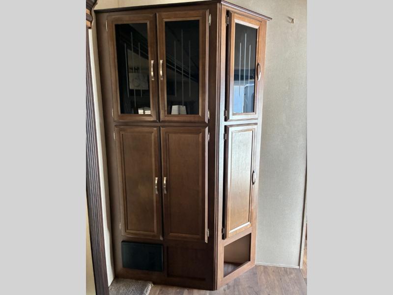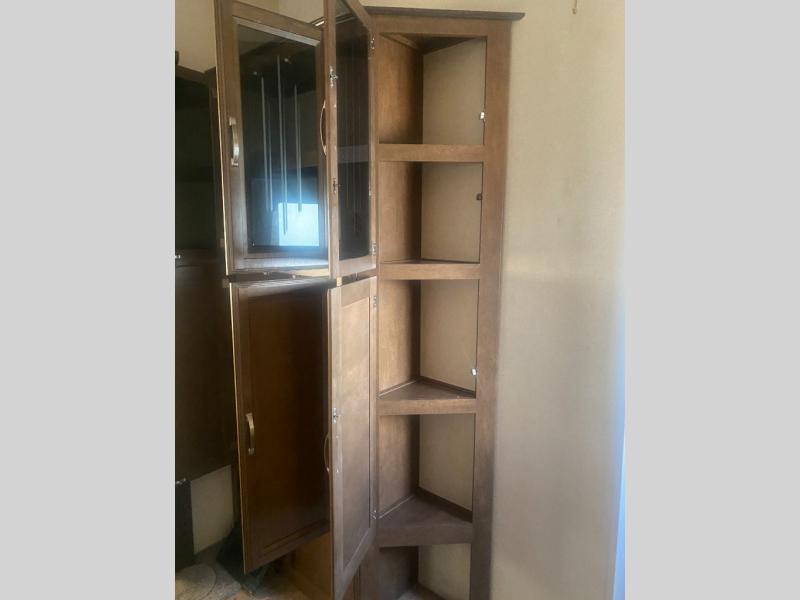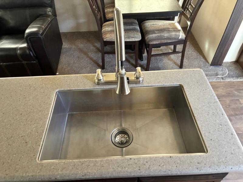 The second slide in this area has theater seating with cup holders, and a dinette. Adjacent to the slide you will find a second pantry and a corner cabinet. In the middle of the kitchen clean up is a breeze with the island and sink.